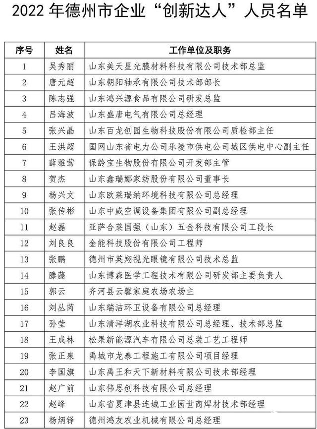 6月22日,记者在德州市科学技术协会获悉,经过广泛发动、审查推荐、网络投票、专家评审等程序,拟确定23名德州市企业“创新达人”,现予以公示。公示期为2022年6月22日至6月28日。