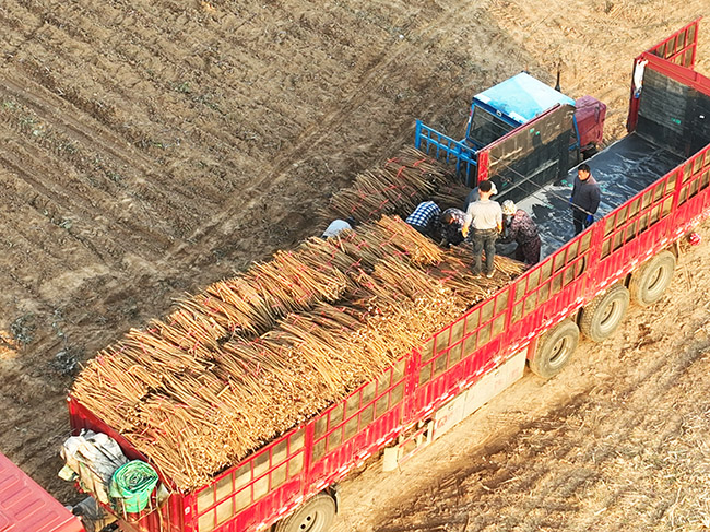 眼下,正值牛蒡丰收时节,在渡口驿乡管新庄村牛蒡种植农田里,一台台牛蒡收获机驶过,村民将牛蒡从地里拔出来,扎捆、装车,紧张忙碌,一气呵成,到处是一派喜庆丰收的热闹景象。