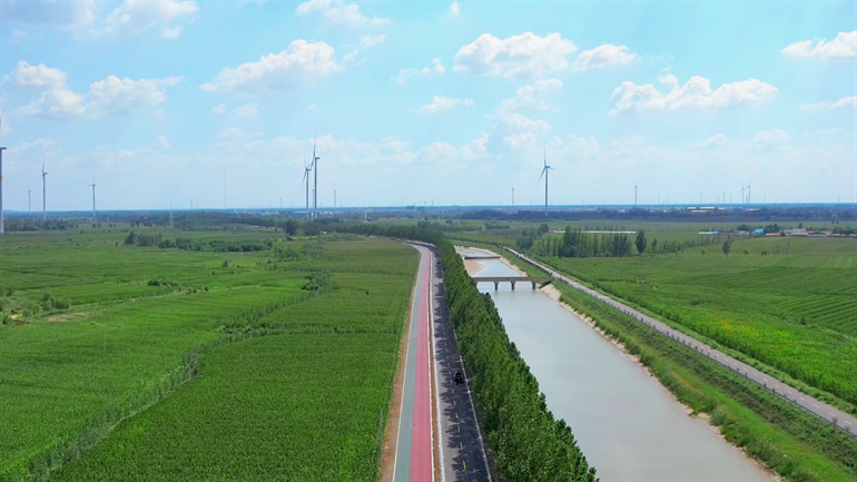 近日,总长度130公里,串联沿途5县18镇黄河大运河连通廊道路网工程全线贯通,万亩生态廊道建设工程全部完成,超前、超额完成2023年挂图作战任务。当前,6米深青色车行道、3米红色骑行道和2米绿色步行道,全线130公里工程建设整齐划一,成为绿色田野间“浓墨重彩”的靓丽风景。