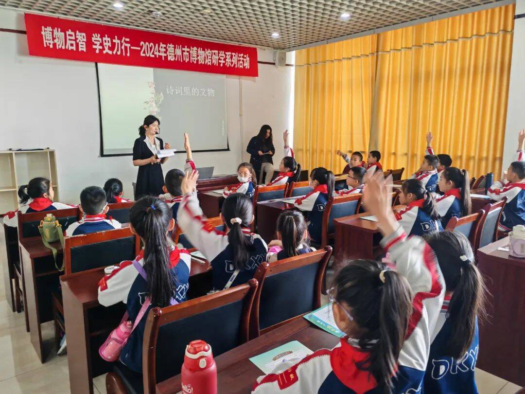 大略网·奏嘛新闻4月13日讯 为拓展中小学生知识面,加深学生对德州地域文化的了解,4月13日,德州市博物馆举行春季研学系列活动举行,邀请德开小学四年级的50名学生走进德州市博物馆,赏精品文物,听诗词故事,沉浸于历史的长河中,许未来之约。本期研学课程的主题是《古诗词里的文物知识》,由德州市博物馆社教部主任宫凯授课。