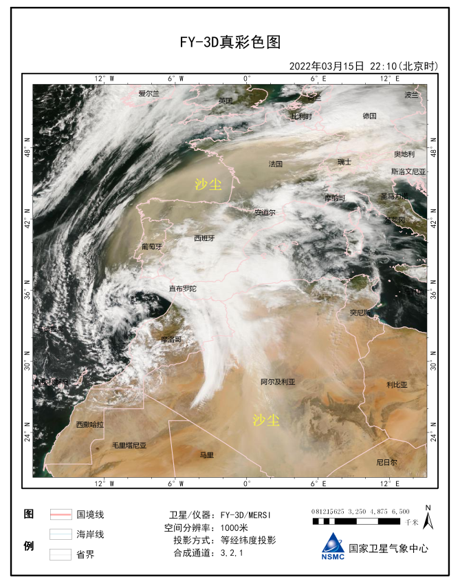 FY-3D气象卫星北非及西欧沙尘监测真彩图 图:国家卫星气象中心