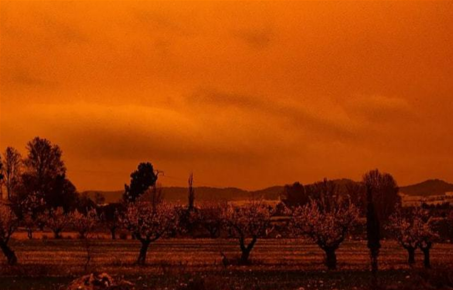 2022年3月欧洲遭遇遇沙尘暴,西班牙天空变成橘红色。图:《太阳报》