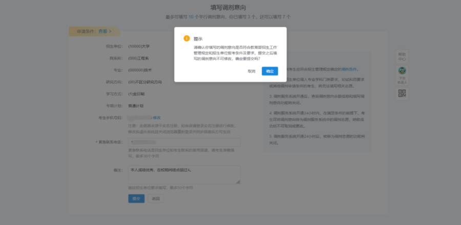 在允许填写调剂意向的时间内,一位考生最多可填写10个平行调剂意向,且提交后不可取消或更改。