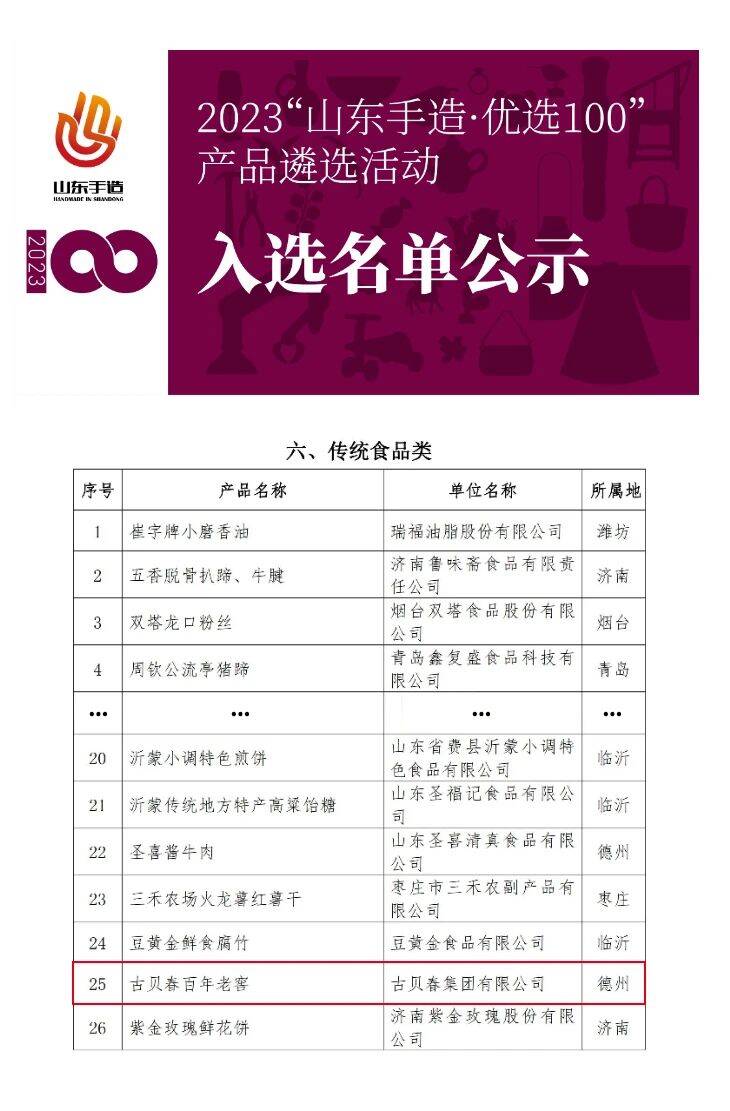 近日,2023“山东手造·优选100”产品遴选活动委员会对入选产品进行了公示,经过层层筛选和严格评审,古贝春公司的“古贝春百年老窖”产品,在众多参选品牌中脱颖而出,成功入选了“山东手造·优选100”产品名单。