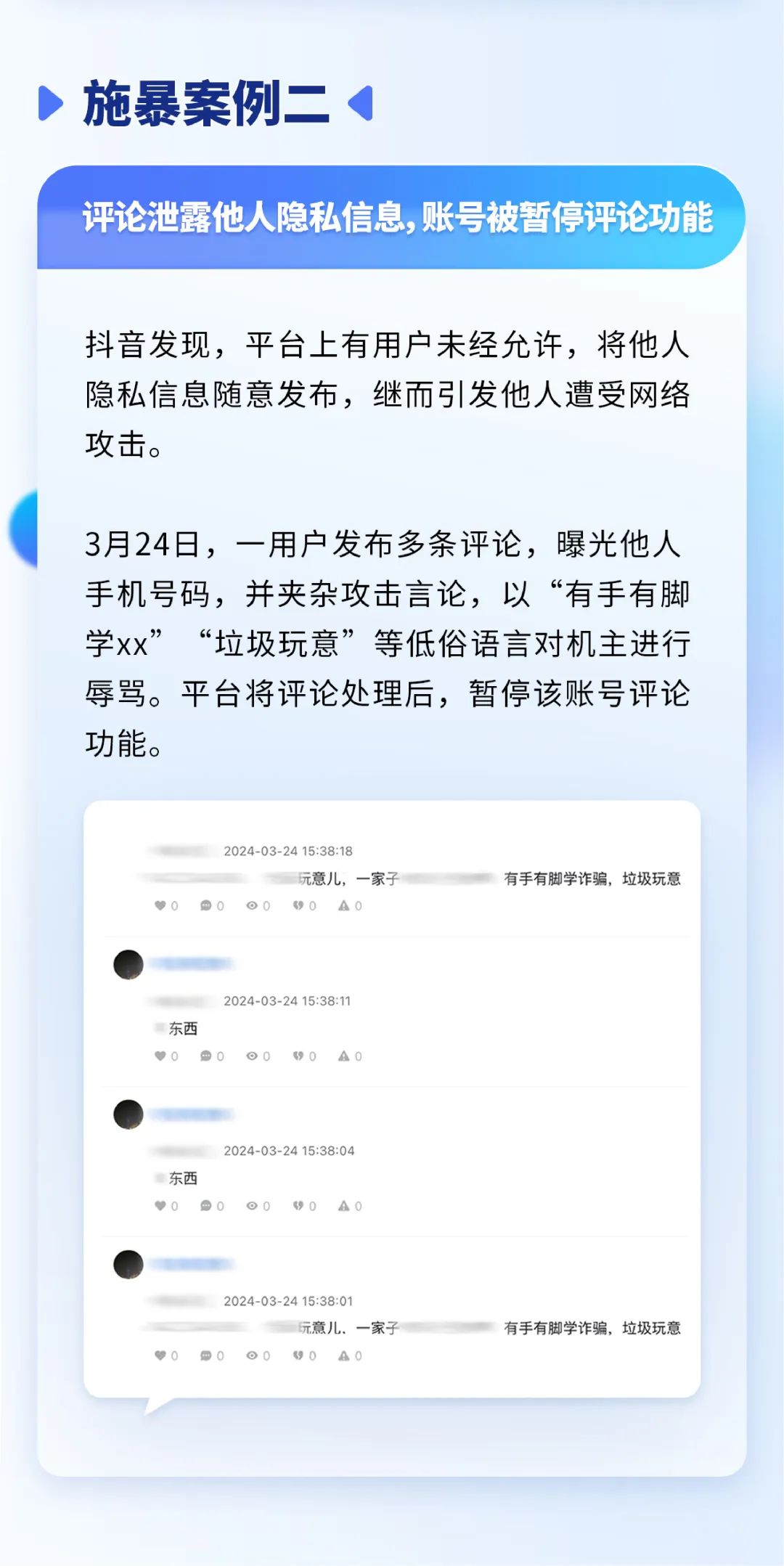 2024年至今,抖音共发现并处置网暴舆情162件拦截超过5000万条评论信息,发文警示、教育施暴者近70万个。以下是四类典型违规行为: