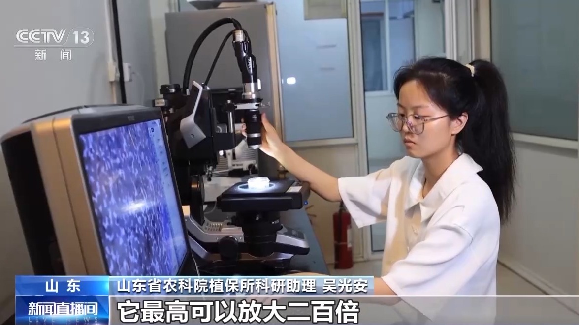 山东省农科院植保所科研助理 吴光安:这个是放大了五十倍的一个效果,在这个镜头上有显示,它最高可以放大二百倍。可以更加清楚地观察天敌昆虫行为学细节性的东西。对我们后期的科研生产,甚至于包括释放、田间推广应用、都有很大的指导性作用。
