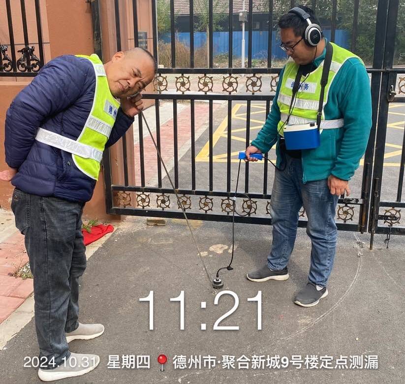 到达小区后,首先在小区主阀门处进行了漏水检测,由于给水井内没有清水,而且管道是PE材质声音传导率差,听不到声音,为尽快找到漏点,张吉敏立刻决定翻找所有的给水井、污水井、雨水井和配电井,沿着管线打开井盖一点点的排查。经过一个多小时的排查,王班长打开一个雨水井喊道:“在这附近,声音很大!”随后大家在附近用听杆和听漏仪反复排查,并没有听到像是漏点的可疑声音。这时王师傅提议先用潜望镜观察一下井内的情况,通过潜望镜观察到管道内并没有水流,推测漏水点跟这里还有段距离。通过对给水工程图的分析,怀疑水流很有可能顺着流到北边去了,随即王师傅带着仪器去北边下坡处进行检测,刚把听杆和听漏仪放下去,就听见耳边传来“哗哗”的声音,但这不是漏水的声音,是因为漏水量大形成了“水包管”,声音大多数是撞击管道的声音和冲击地面的声音,漏水的声音反而很小。于是又在砖缝处用探棒打了个孔,就这样大家反复听音,听杆听漏仪在附近来回穿梭,最终在一处地面听到细微的不同,经过对此处反复听音和讨论,最终确定此处为漏水点,同时立即将漏水点上报给德城管网管理处,等待进一步抢修。