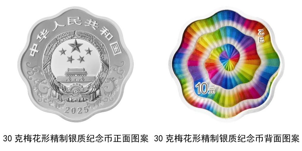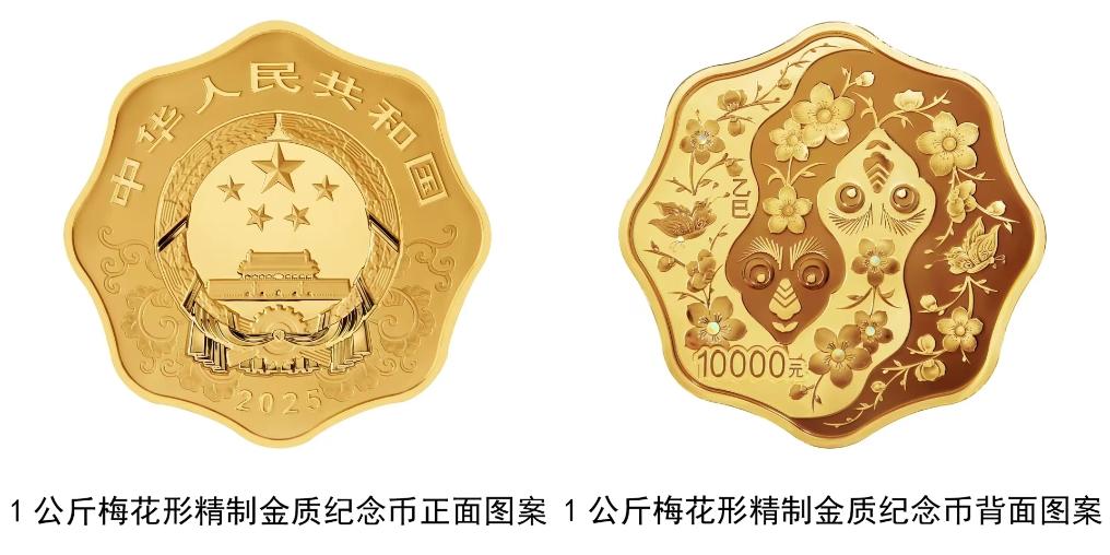 其中,1公斤梅花形金质纪念币背面图案为装饰双蛇造型,衬以蝴蝶、吉祥花卉组合设计,含纯金1公斤,最大发行量118枚。