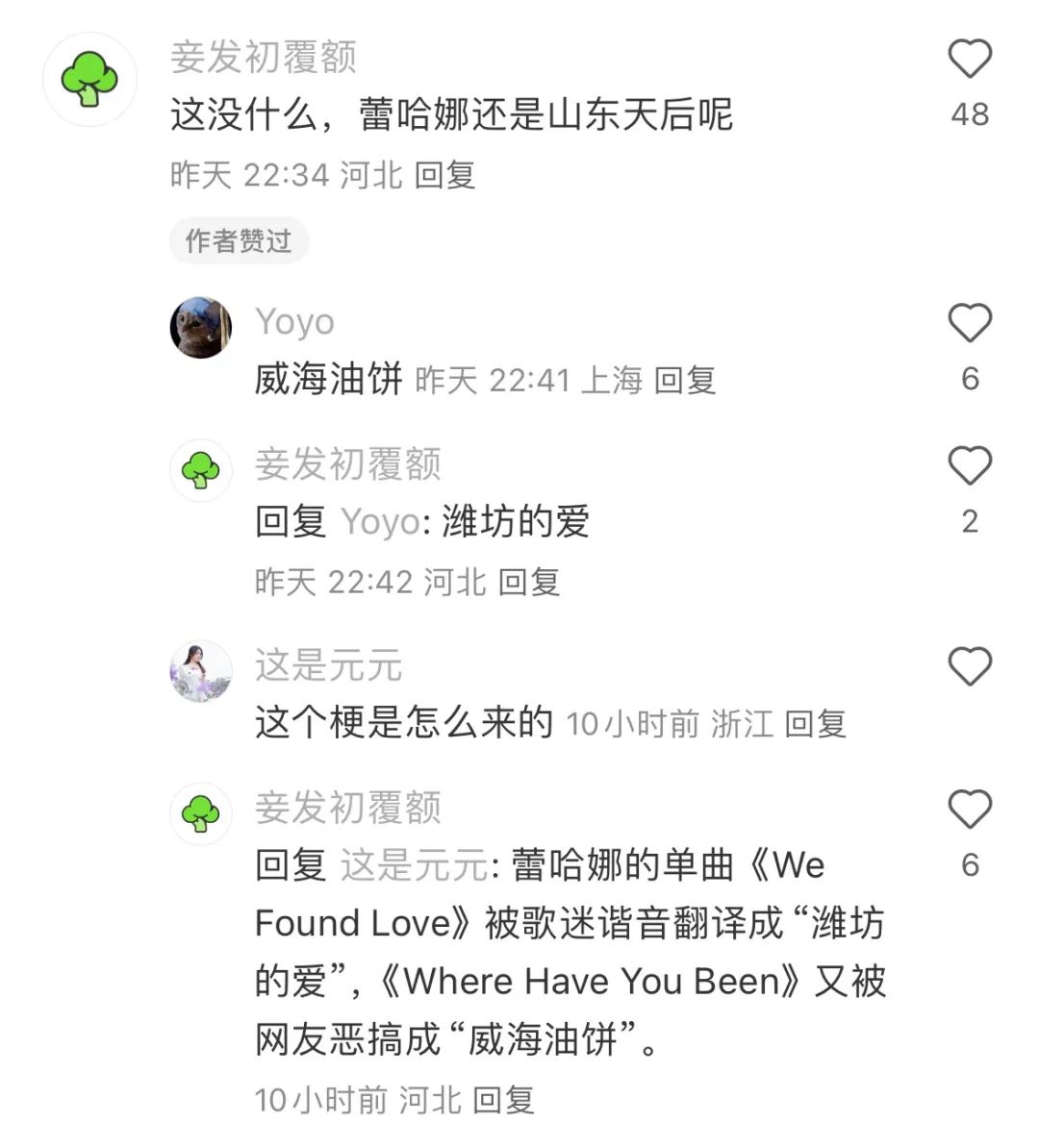 河北网友表示蕾哈娜凭借“潍坊的爱”和“威海油饼”