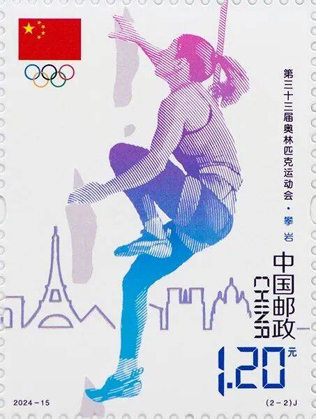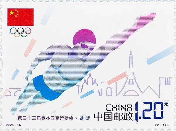 2024年7月26日,第三十三届奥林匹克运动会于法国巴黎开幕,中国邮政发行《第三十三届奥林匹克运动会》纪念邮票1套2枚,邮票图案名称为游泳、攀岩。画面的设计通过极简的线条语言勾勒出运动员的动态张力。