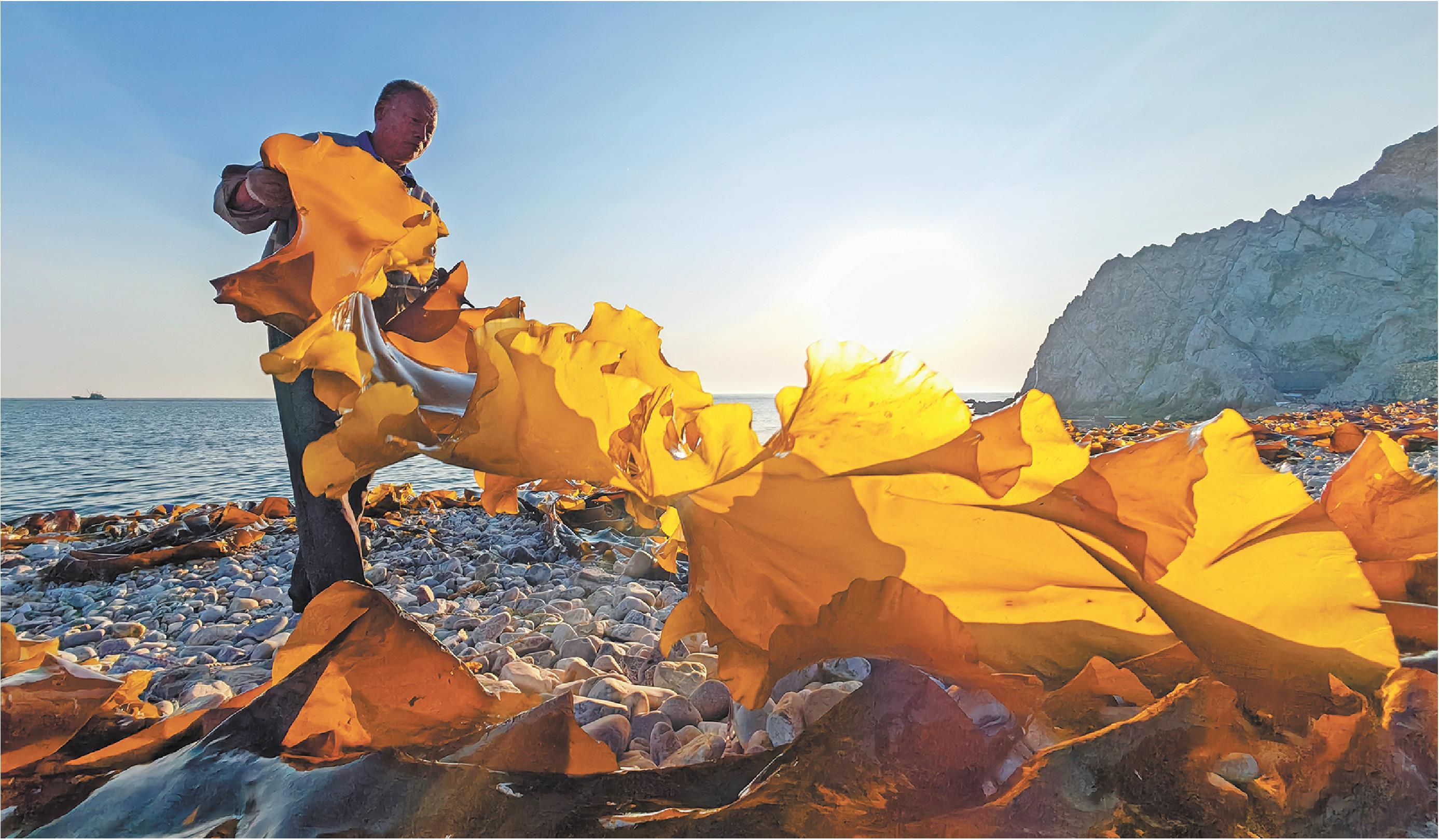 夕阳下,在大钦岛西口的晾晒场,工人将长长的海带铺在石头上晾晒。