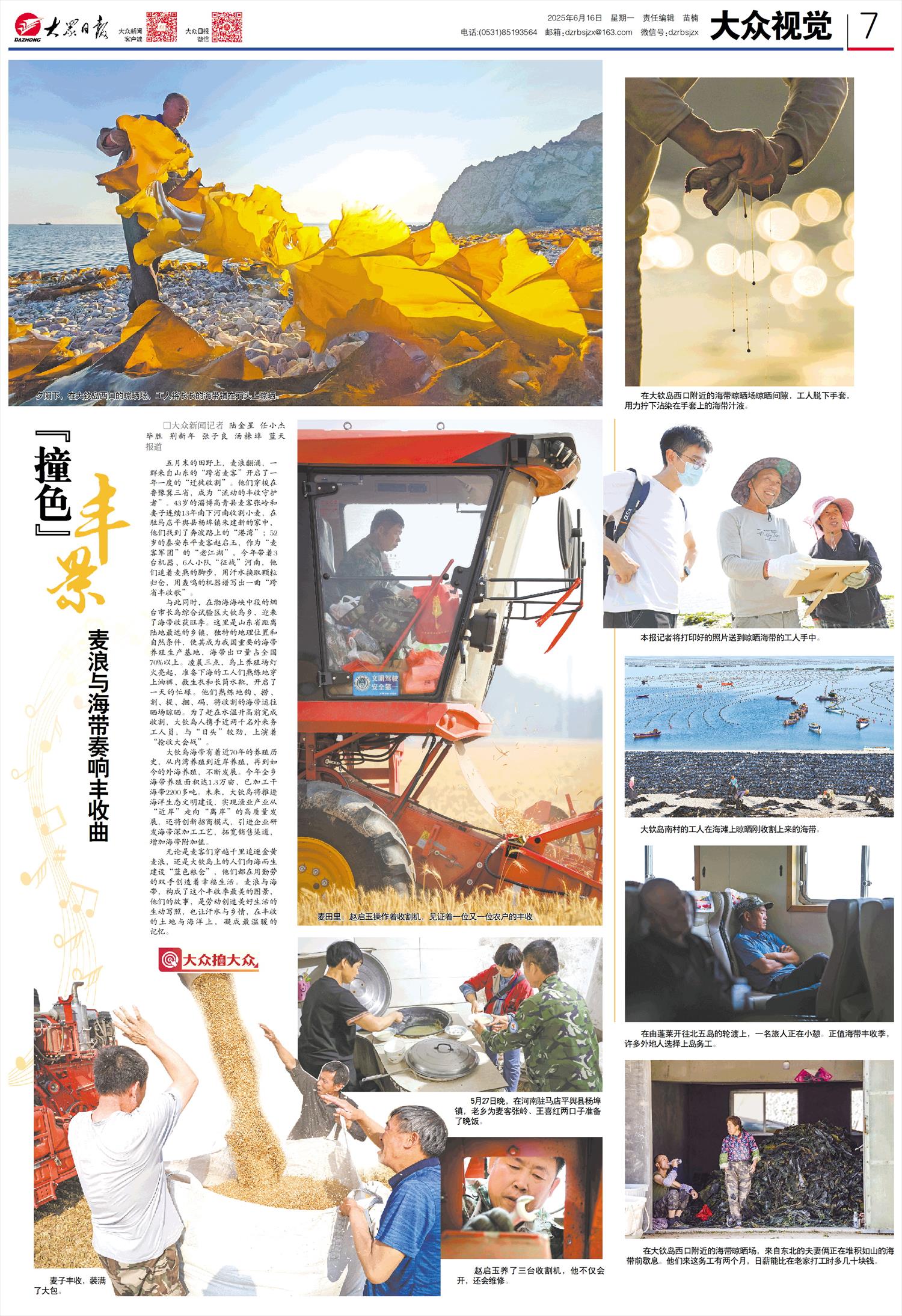 无论是麦客们穿越千里追逐金黄麦浪,还是大钦岛上的人们向海而生建设“蓝色粮仓”,他们都在用勤劳的双手创造着幸福生活。麦浪与海带,构成了这个丰收季最美的图景,他们的故事,是劳动创造美好生活的生动写照,也让汗水与乡情,在丰收的土地与海洋上,凝成最温暖的记忆。