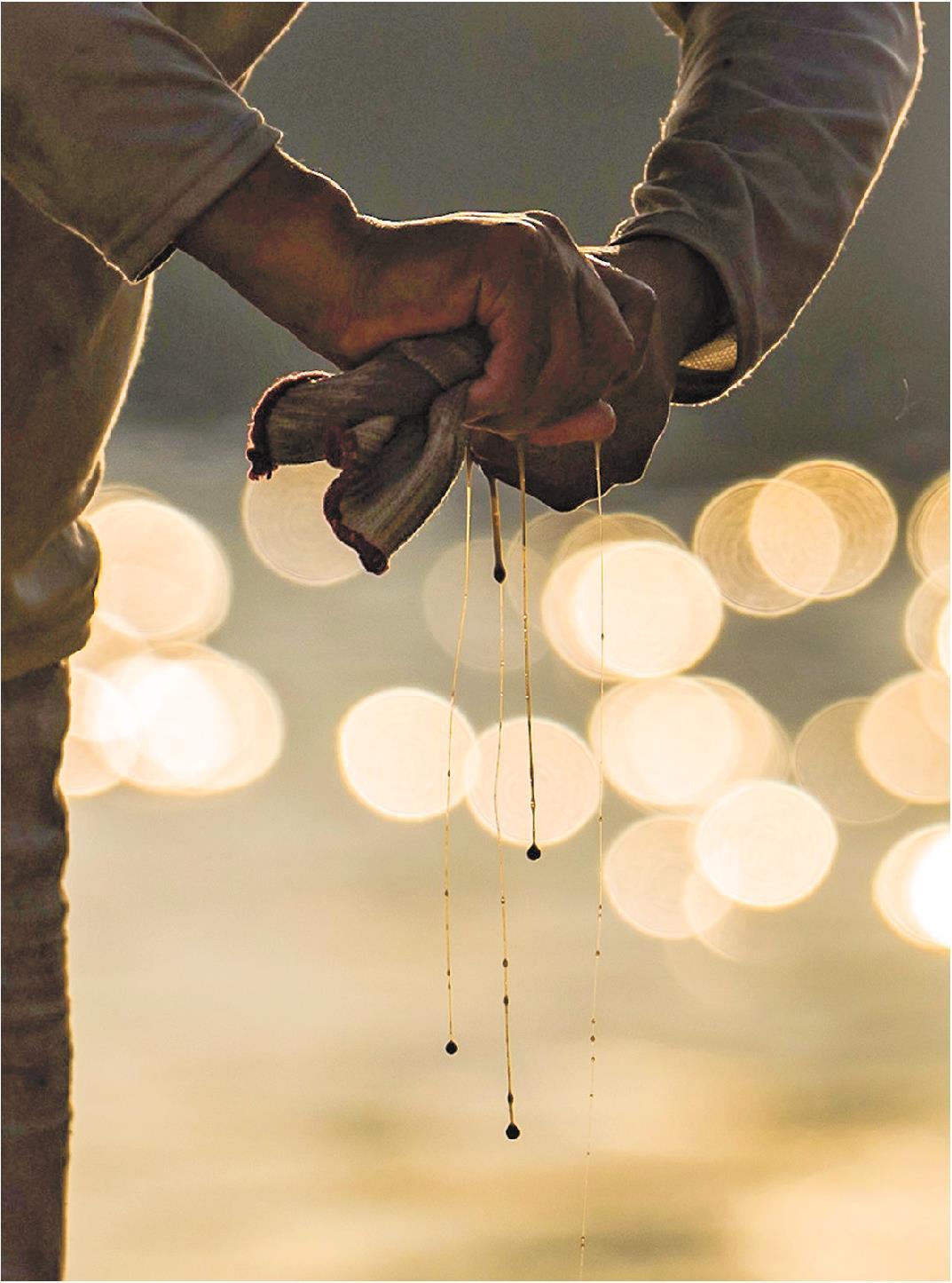 在大钦岛西口附近的海带晾晒场晾晒间隙,工人脱下手套,用力拧下沾染在手套上的海带汁液。