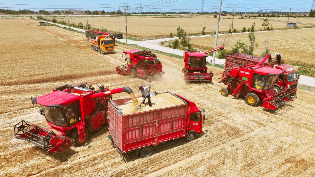 6月12日,潍坊寿光市营里镇淼汇叁号家庭农场2600亩麦田,九台红色收割机一字排开次第开镰,农场夏收开始了。