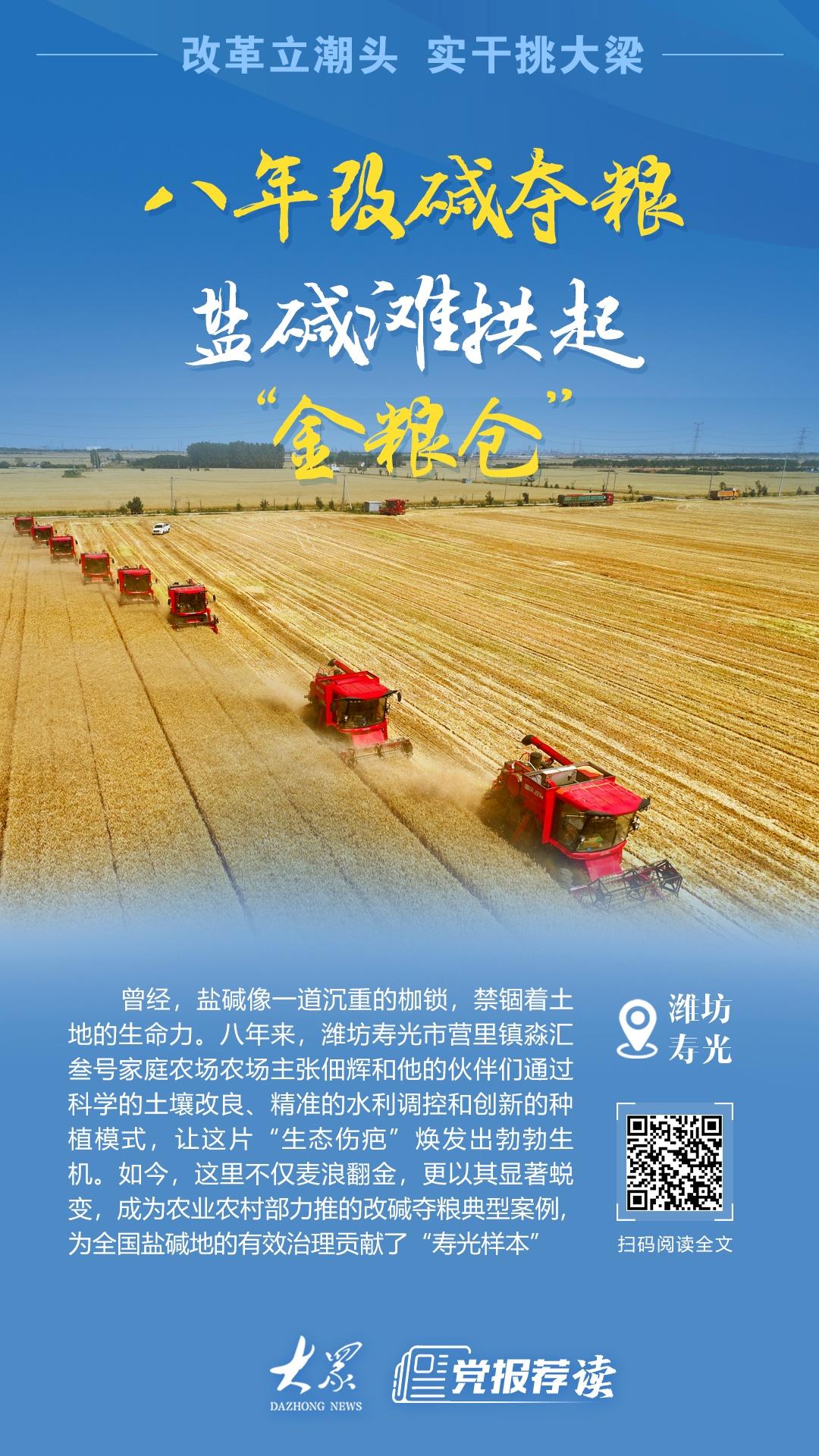 “中国人的饭碗任何时候都要牢牢端在自己手上。我们的饭碗应该主要装中国粮。”近年来,山东扛牢保障国家粮食安全重任,让“中国碗”盛满更多“山东粮”。山东淼汇农场用八年时间,将pH值高达9.3的盐碱地改造为亩产超600公斤的“金粮仓”,这是山东新农人守护粮食安全的奋斗故事。