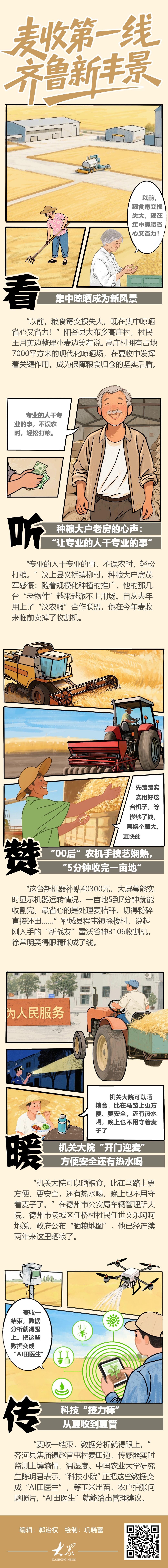 连日来,大众日报·大众新闻记者深入麦收第一线,捕捉齐鲁大地这最动人的丰收季。在系列鲜活文字报道的基础上,大众新闻客户端推出“麦收第一线 齐鲁新‘丰’景”手绘长图,邀您一道沉浸式感受这片金黄画卷中蕴藏的服务温度、科技力度与惠民深度。