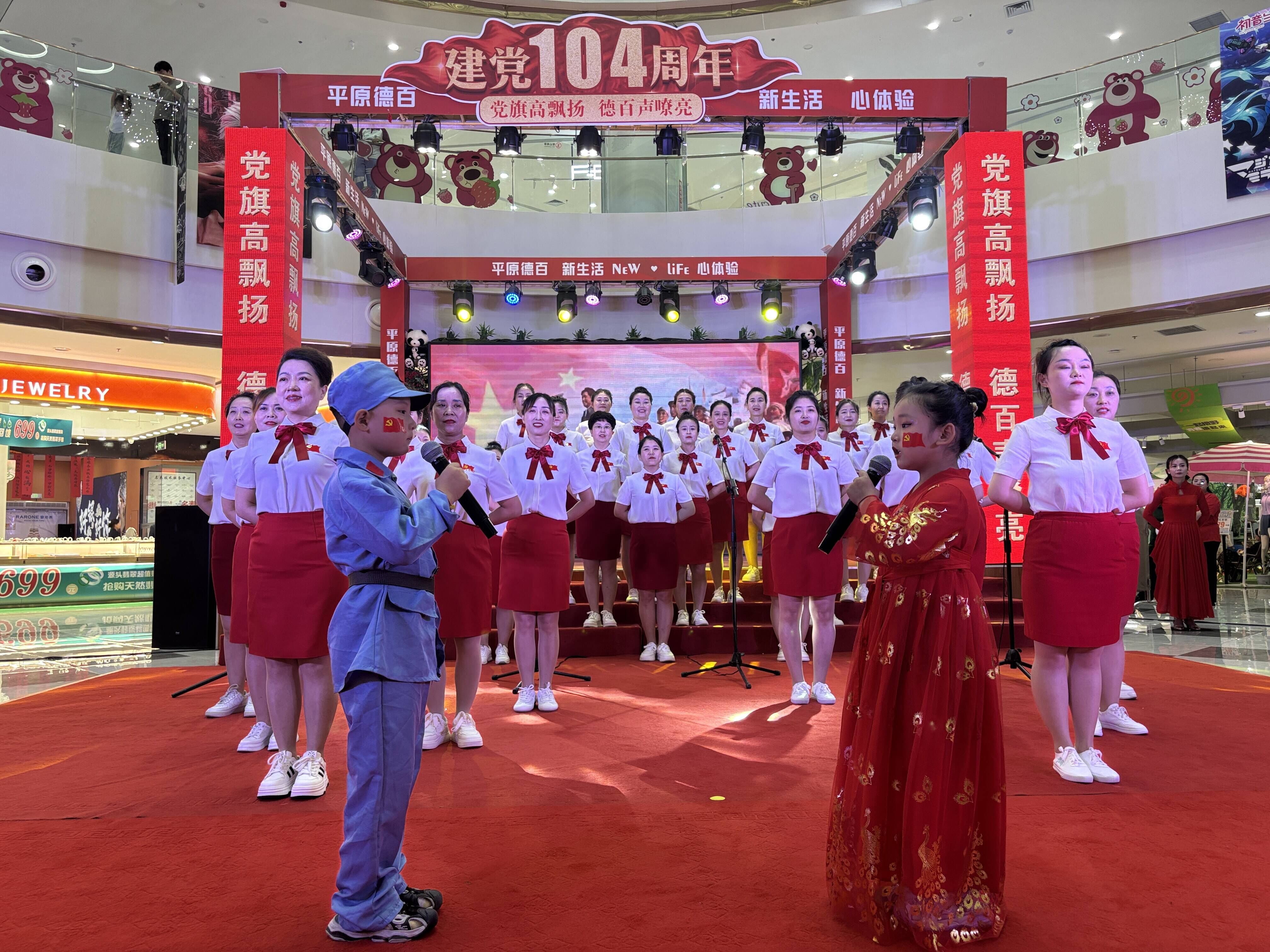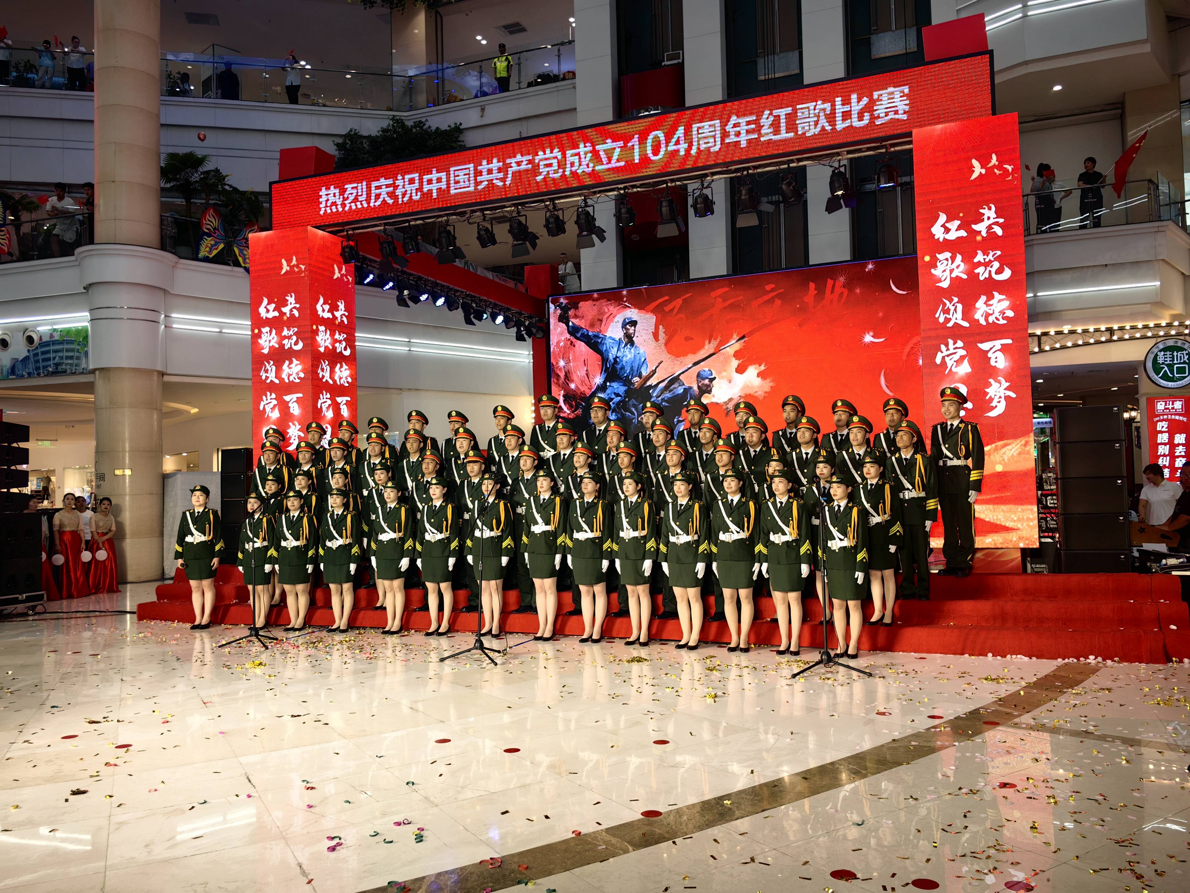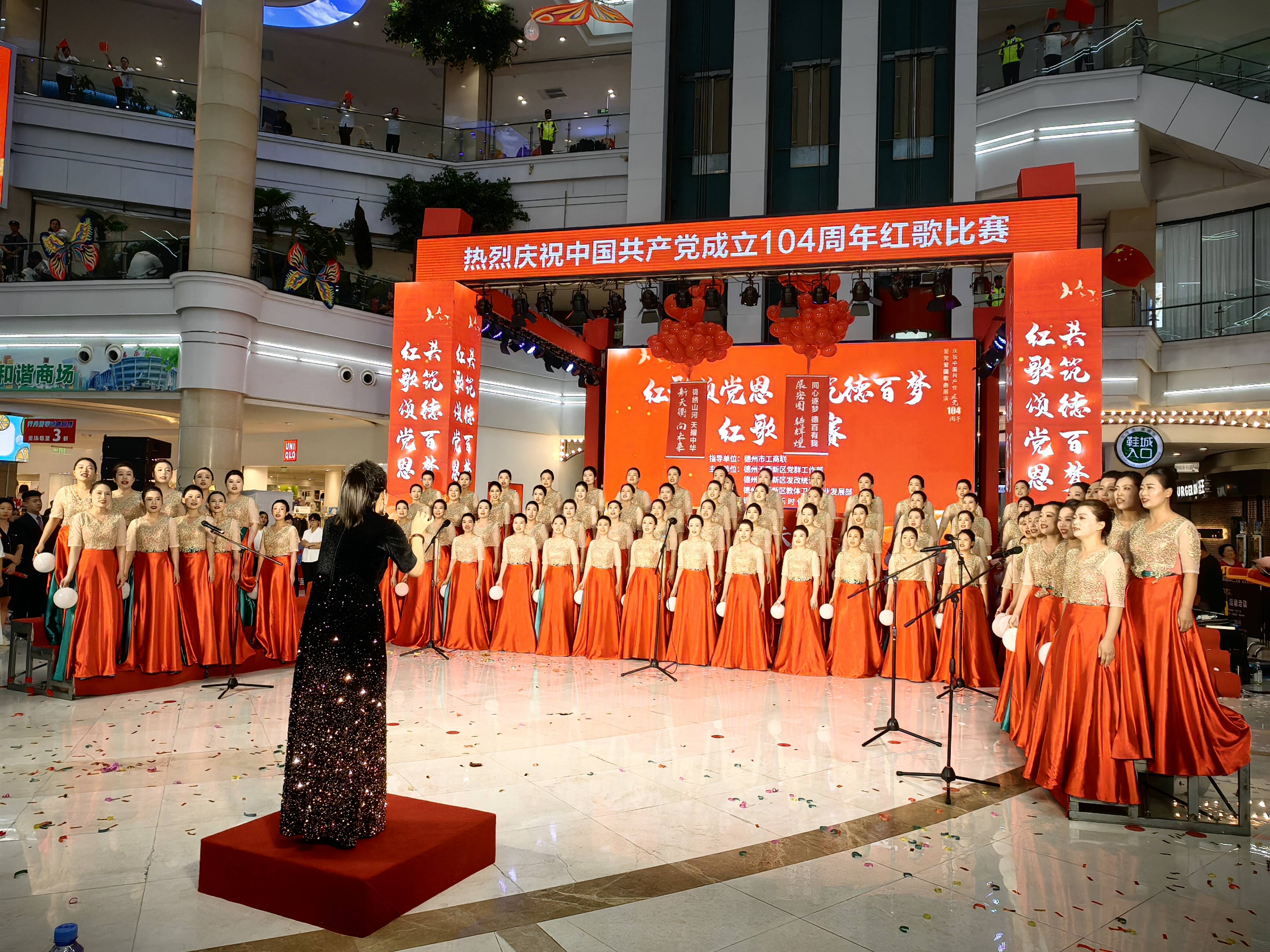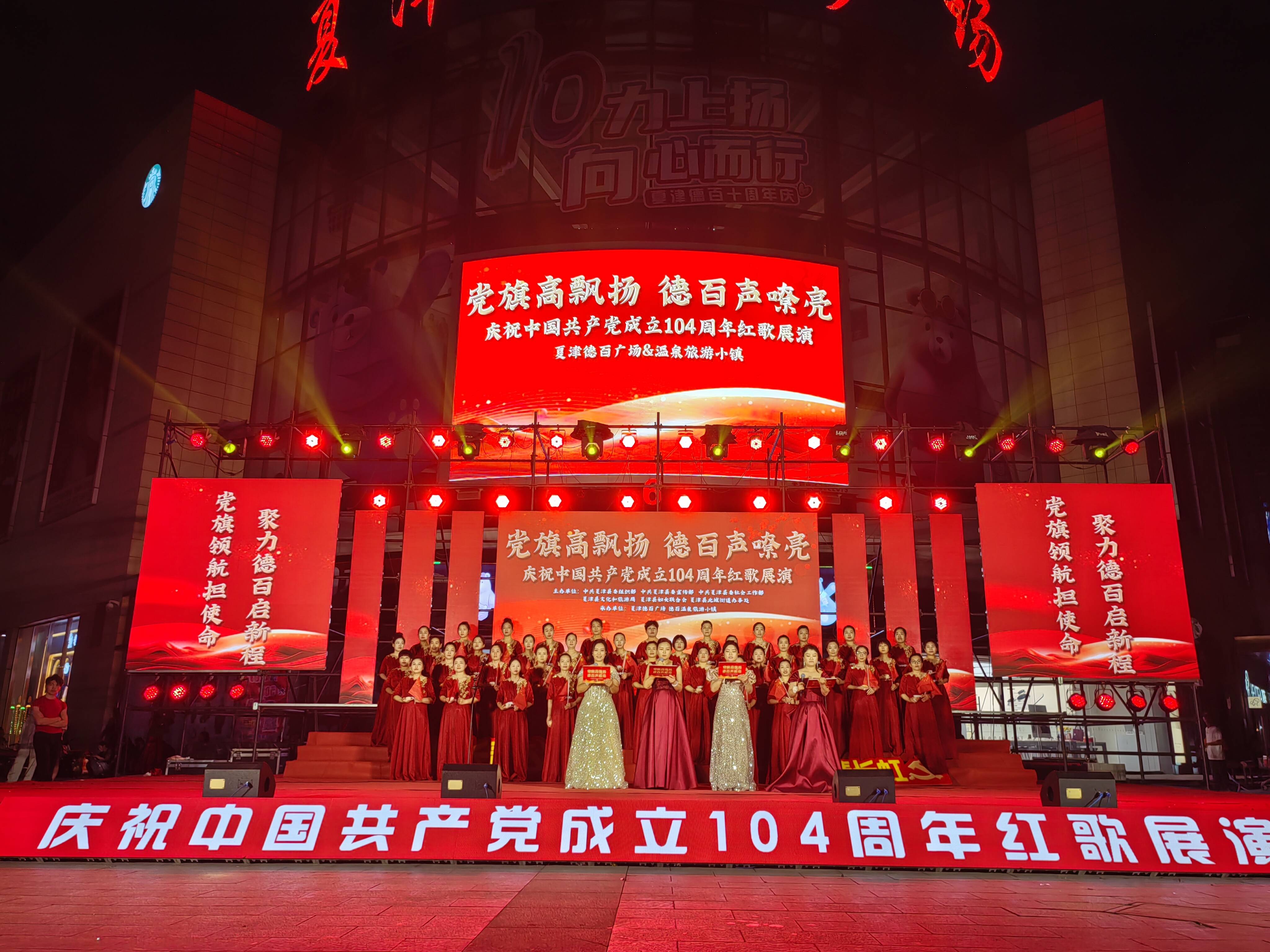 大略网·奏嘛新闻6月27日讯 6月27日晚,为庆祝中国共产党成立104周年,澳德乐时代广场开展了“红歌颂党恩 共筑德百梦”红歌展演活动。