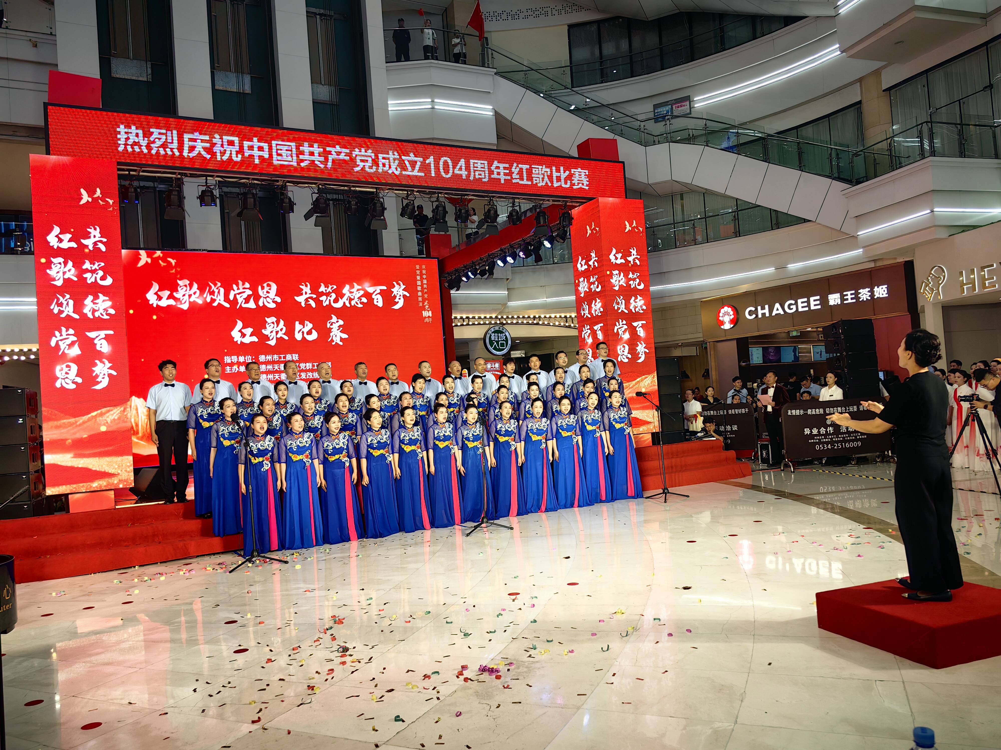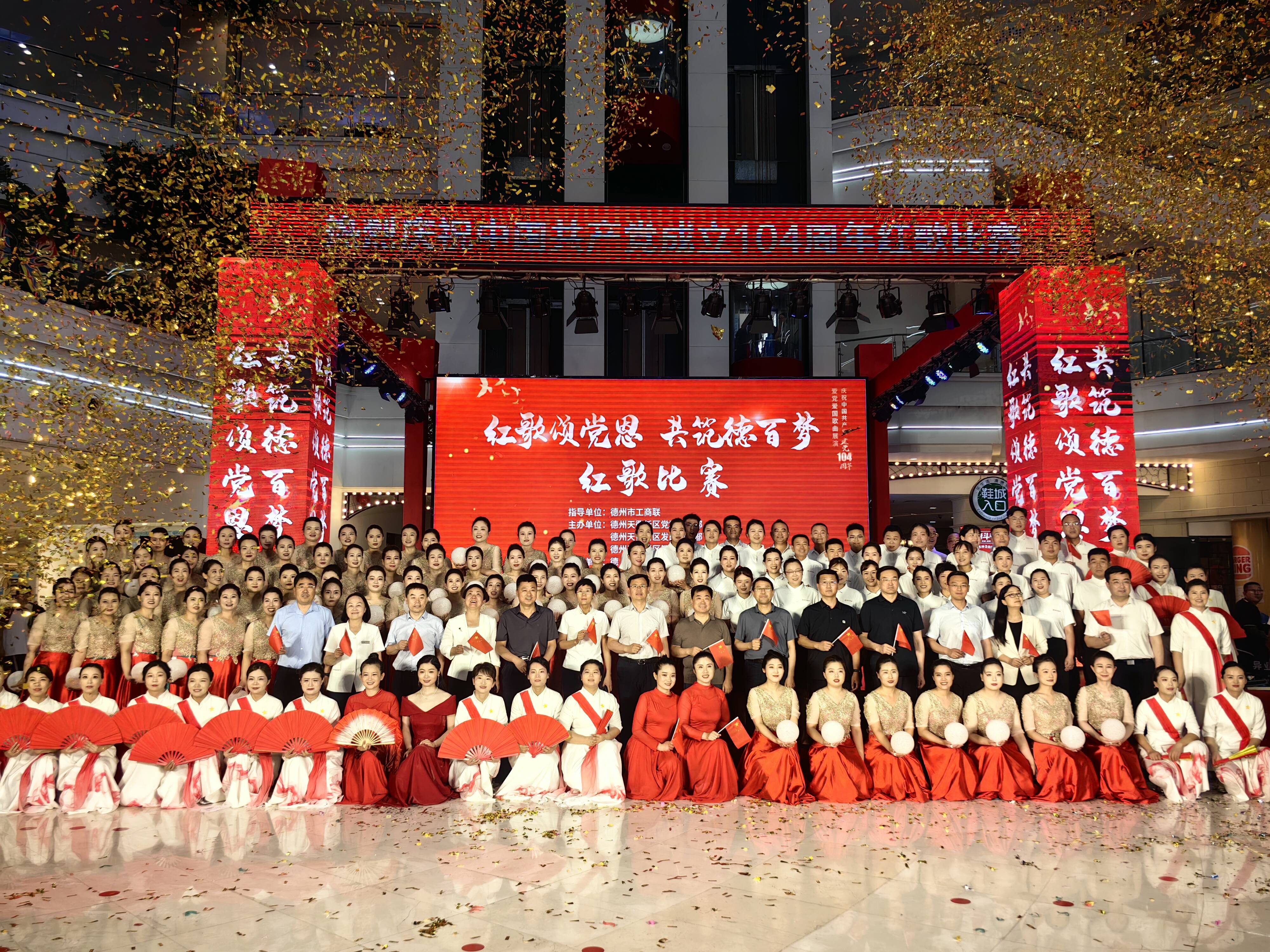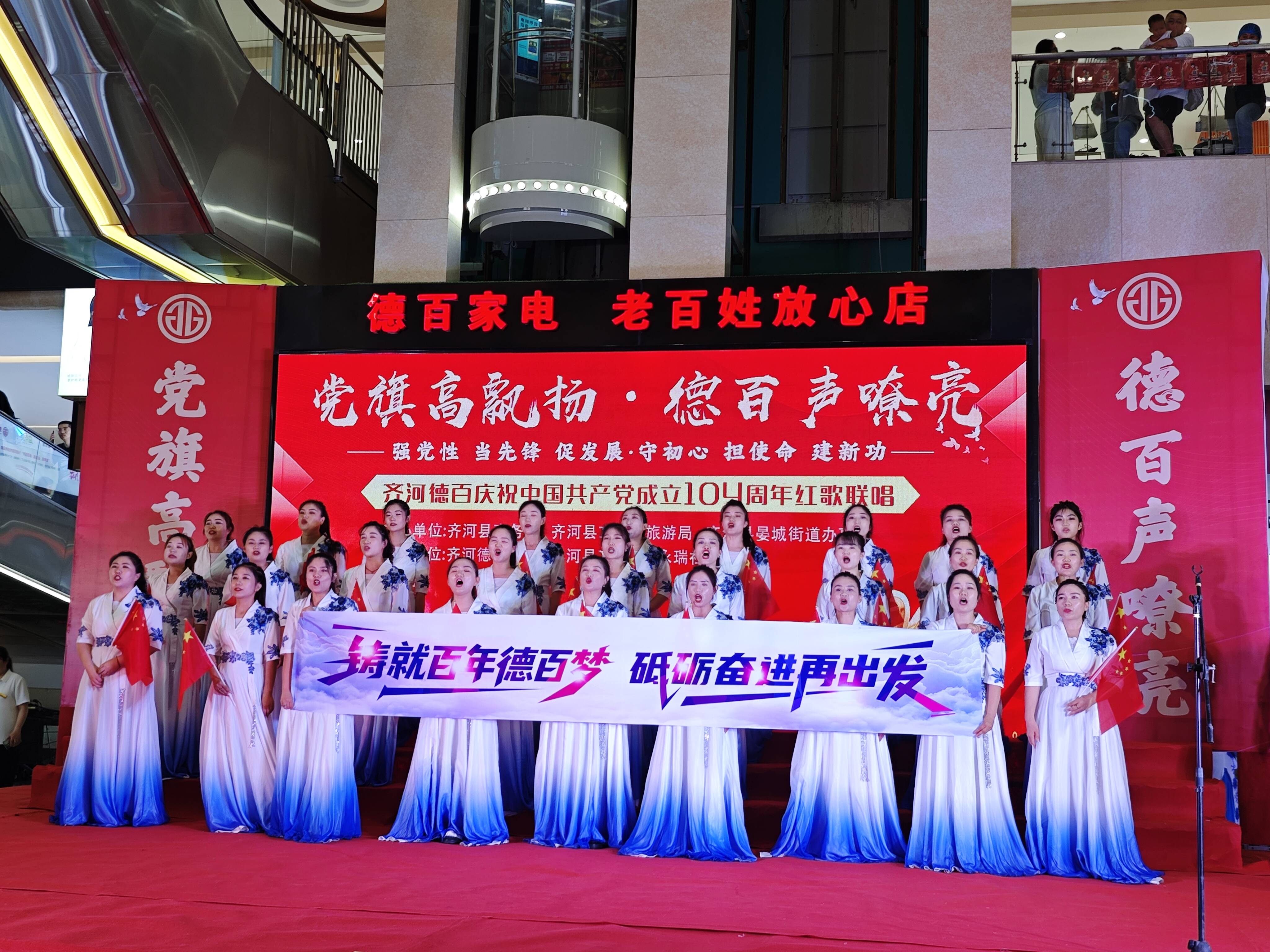 傍晚七时,红歌展演在嘹亮的歌声《国家》中拉开序幕,本次展演共有澳德乐奥莱、德百家居广场和德百批发城3个单位6支代表队登台演出、传唱经典。《泉水叮咚响》《万疆》《中国飞翔》《天耀中华》《当那一天来临》等经典曲目,唱出德百人的赤诚之心,让红色的精神在新时代焕发新的光芒!她们昂扬向上的精神风貌,气势豪迈的铿锵韵律,久久回荡,热烈的掌声经久不息。