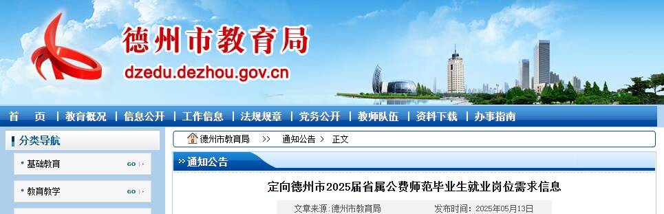 大略网·奏嘛新闻5月13日讯 5月12日,德州市教育局发布定向德州市2025届省属公费师范毕业生就业岗位需求信息。