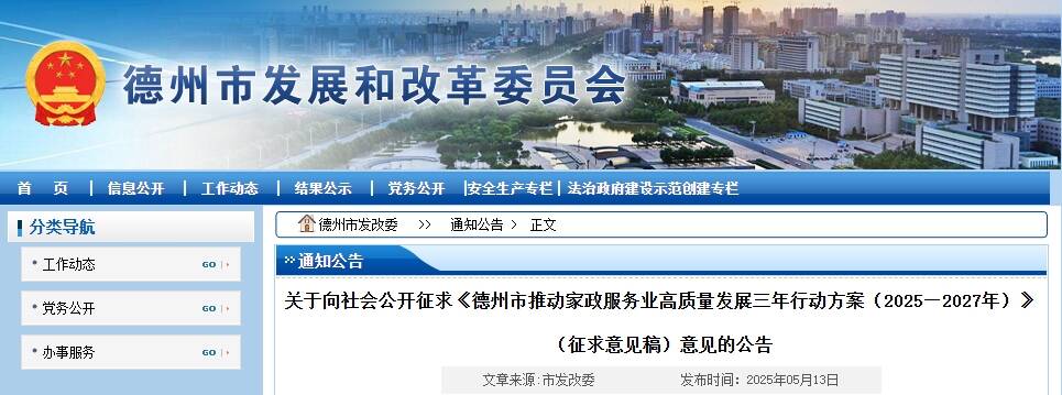 大略网·奏嘛新闻5月14日讯 5月13日,德州市发展和改革委员会发布关于向社会公开征求《德州市推动家政服务业高质量发展三年行动方案(2025—2027年)》(征求意见稿)意见的公告。