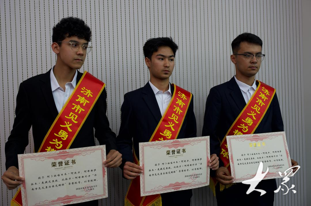 近日,山东省济南市举行见义勇为称号授予仪式,对山东劳动职业技术学院三名新疆籍学生——阿卜杜喀日木、比拉力、阿布都萨拉木勇救落水群众的义举予以表扬,授予他们“济南市见义勇为模范群体”荣誉称号,给予每人2万元奖励金。这是继济南市长清区为三人颁发见义勇为确认证书和奖励金后,三人再次因英勇行为受到表扬。