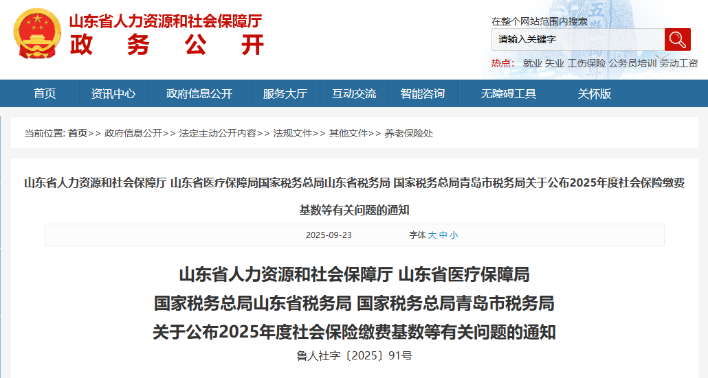 山东省人力资源和社会保障厅 山东省医疗保障局 国家税务总局山东省税务局 国家税务总局青岛市税务局关于公布2025年度社会保险缴费基数等有关问题的通知
