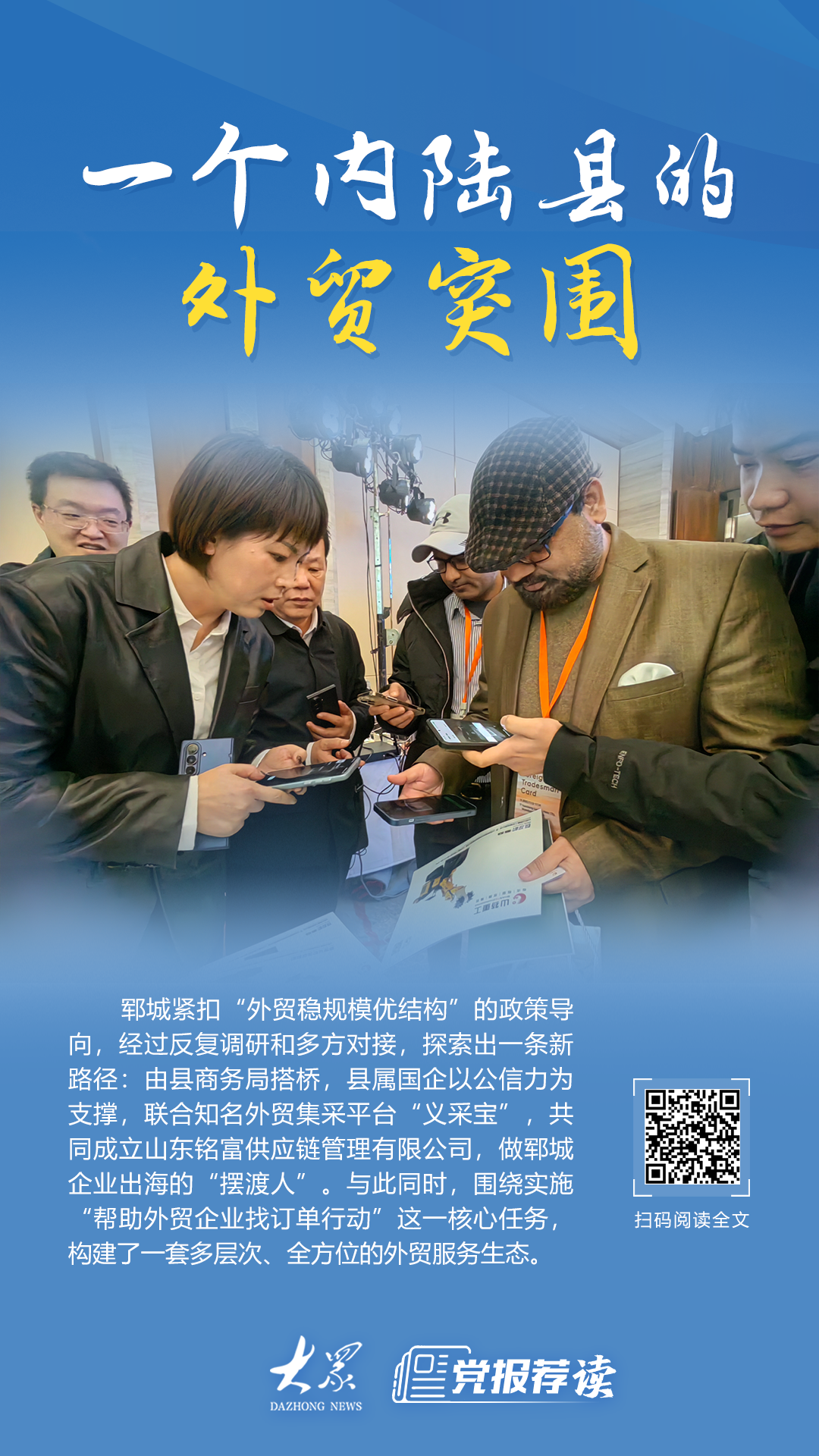 单一平台的搭建只是郓城外贸突围的一个缩影,更深层次的变革,则体现在当地围绕实施“帮助外贸企业找订单行动”这一核心任务,构建的一套多层次、全方位的外贸服务生态上。