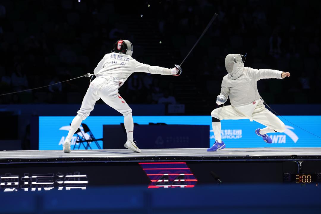 9个回合比赛,最后一回合由魏振浩对战邓小浩——本届全运会佩剑个人冠军对战上届全运会佩剑个人冠军,比赛打得惊心动魄。战场所有人的心都提到了嗓子眼,40:38,41:40,42:41,44:43……中间魏振浩还在一轮攻防后因惯性和腿部拉伤倒地,裁判呼叫赛场医生进行查看和简单处理后方才恢复比赛。最后一轮攻防,魏振浩以静制动,防守后迅捷反击,45:43,拿下制胜一分。