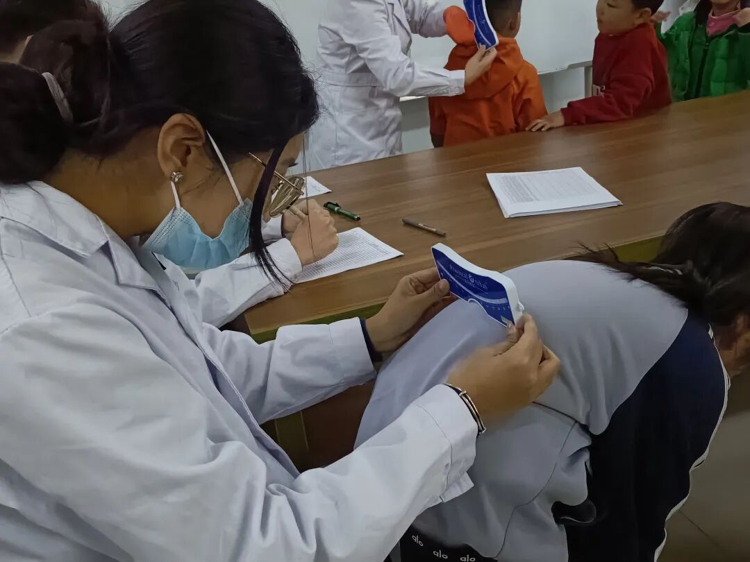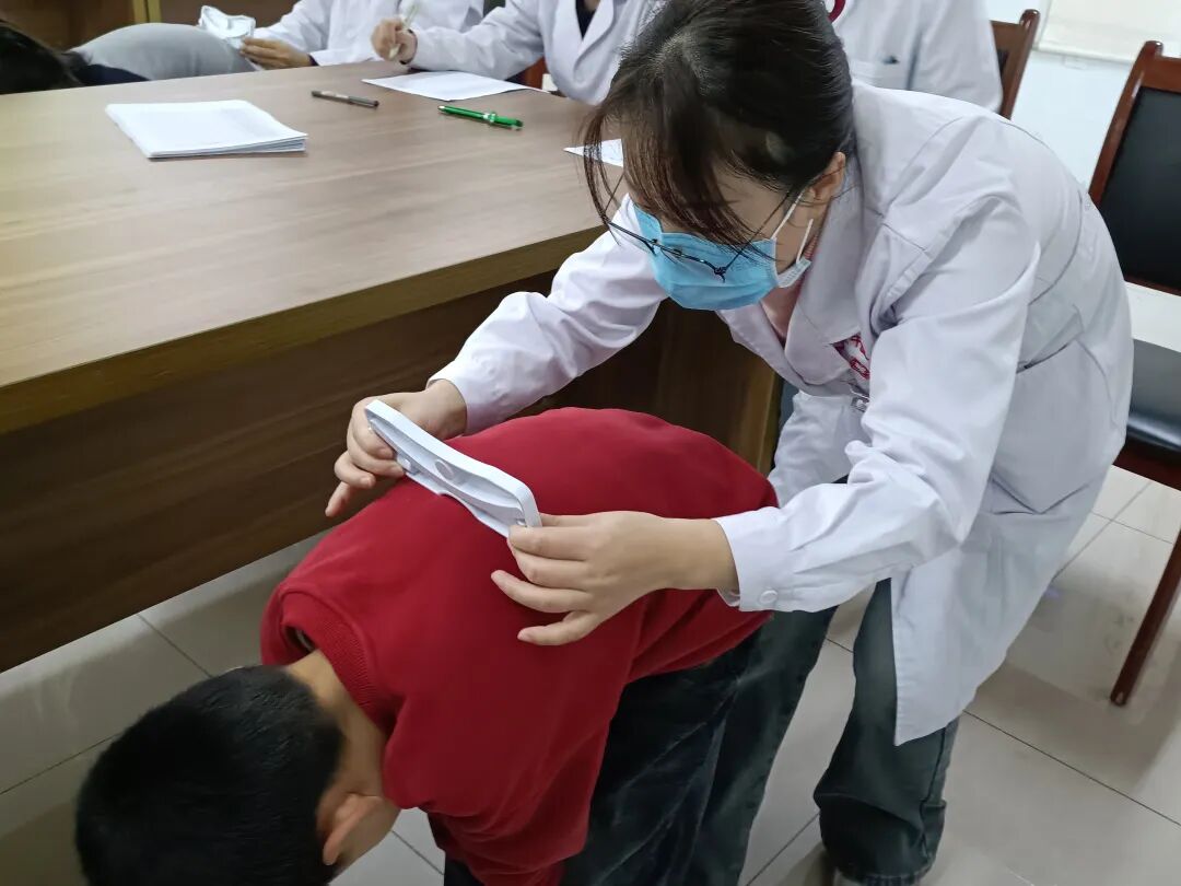 活动现场,医院康复医学科儿童康复专家团队秉持严谨细致的态度,采用“望形态、摸脊柱、测平衡”的中医特色筛查方法,通过观察学生站立姿态、触摸脊柱生理曲度、检测双肩及骨盆对称度等方式,为每位学生进行全面评估。针对筛查中发现的脊柱姿态异常等可疑情况,专家们不仅耐心询问学生日常学习习惯、运动情况,还逐一建立个性化健康档案,通过老师、家长联合对学生的脊柱侧弯情况加强日常姿势管理。