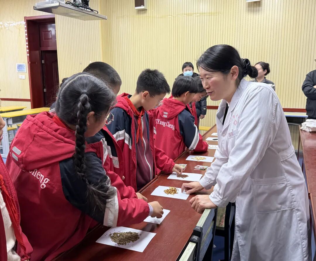 为了让孩子们更直观地感受中医药的独特魅力,王丽英特意带来了山楂、陈皮、花椒、枸杞等多种常见中药材样本,一一摆放在讲台上。课堂互动环节,她邀请孩子们轮流上前观察、触摸药材,仔细讲解每一味药材的名称、外形特征、性味归经以及功效用途。孩子们围在药材旁,眼神里满是好奇,一边认真聆听,一边积极举手提问,“陈皮是橘子皮做的吗?”王丽英耐心地逐一解答,用生动的比喻和通俗的讲解,将专业的中医药知识变得浅显易懂,让孩子们在互动探索中收获满满。