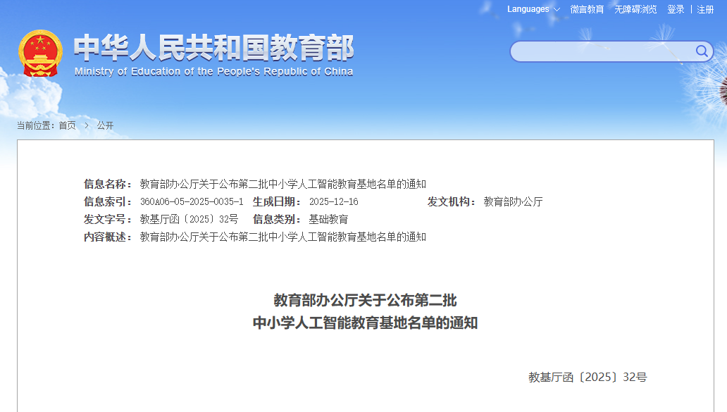 根据《教育部办公厅关于开展第二批中小学人工智能教育基地推荐工作的通知》(教基厅函〔2025〕15号)要求,经各省教育行政部门推荐、教育部集中公示等环节,最终确定了第二批中小学人工智能教育基地325个,现予以公布(名单见附件)。