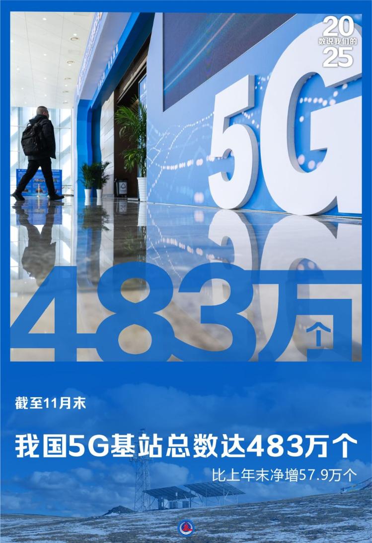 记者12月22日从工业和信息化部获悉,2025年前11个月,我国通信业整体运行平稳。其中,截至11月末,5G基站总数达483万个,比上年末净增57.9万个。 ↓