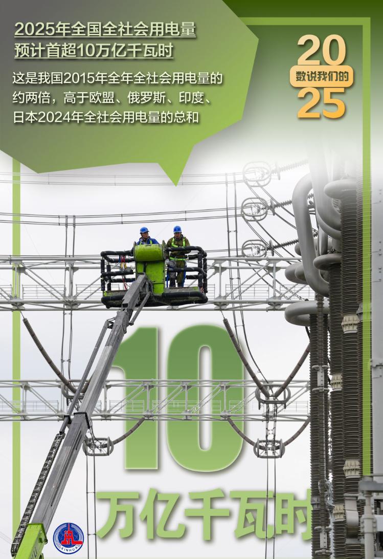 记者12月15日从2026年全国能源工作会议获悉,2025年全国全社会用电量预计首超10万亿千瓦时。从纵向比,这是我国2015年全年全社会用电量的约两倍;从横向看,高于欧盟、俄罗斯、印度、日本2024年全社会用电量的总和。↓