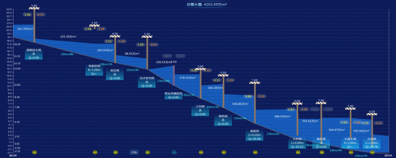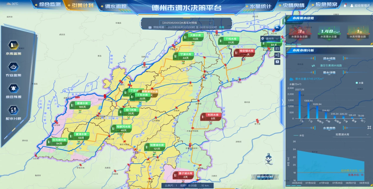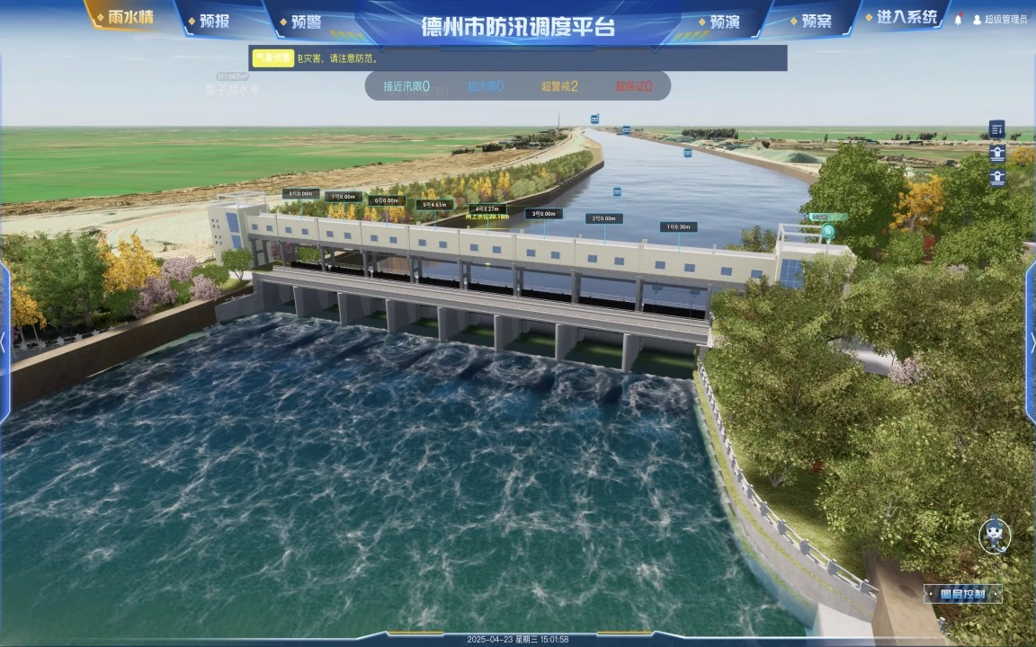 该项目的落地应用,实现了德州水利治理的三大突破性升级:首次达成“防洪安全”与“供水保障”协同优化,通过实时模拟雨情、水情变化,精准预测河道水位、流量动态,提前制定防汛调度方案,2024年汛期有效削减洪峰流量15%,保障了沿岸20余万亩农田及30万群众的生命财产安全;提升水资源调配效率,依托平台动态监测全市14座泵站、88处闸站运行状态,2023-2024年度精准完成6.3亿立方米供水任务,为农业灌溉、工业生产及居民生活用水提供稳定保障;打通跨部门协同壁垒,整合水利、应急、农业等多部门数据资源,实现水情监测、调度指令、应急响应“一网通办”,使应急响应效率较传统模式提升50%以上。