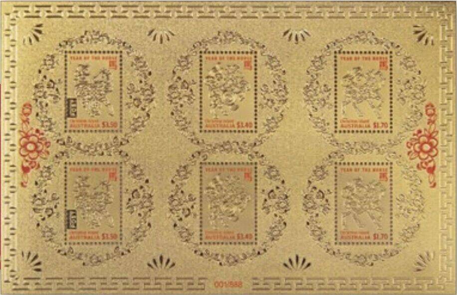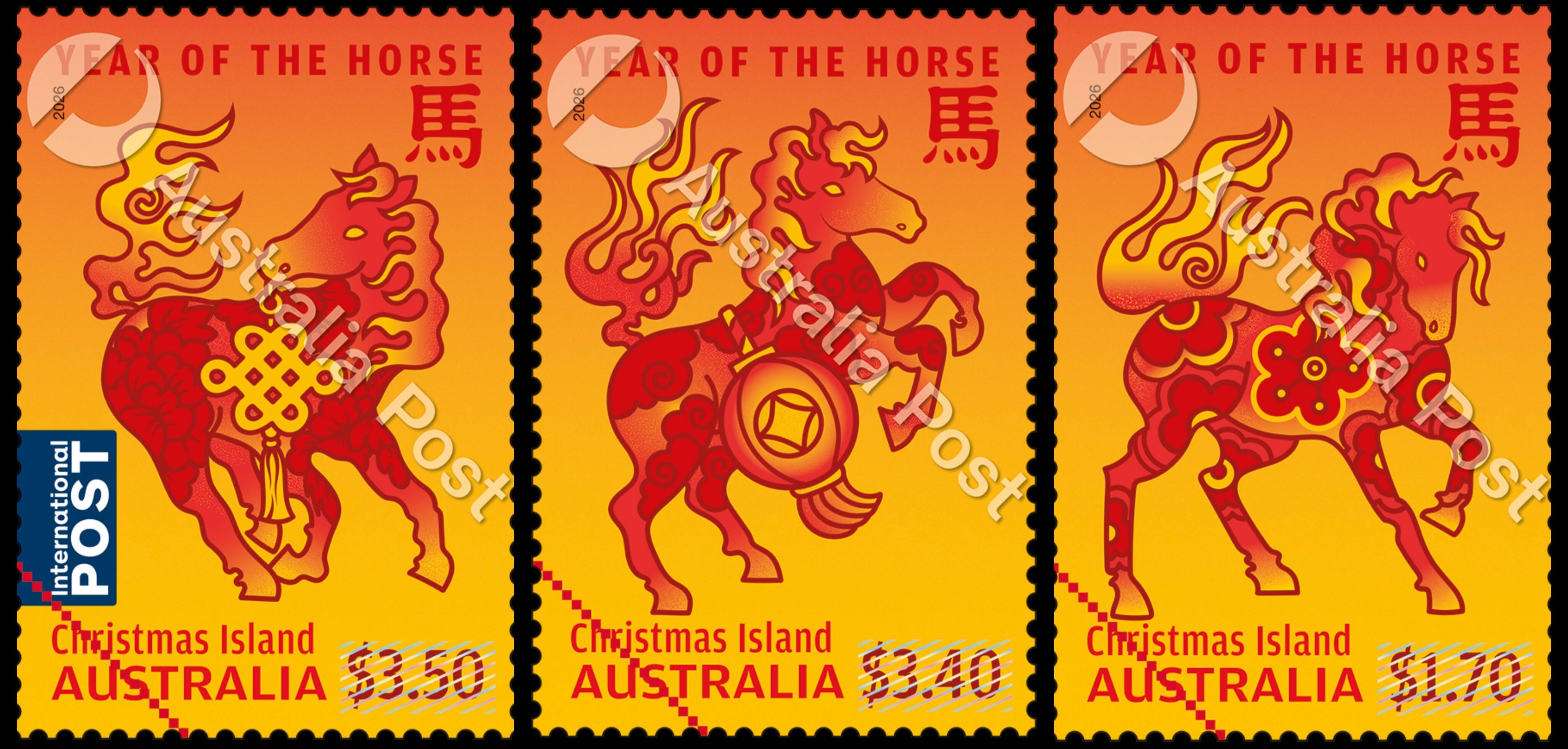 澳大利亚邮政在6日发行的马年邮票名称分别为梅花赤马、灯笼火马与长寿结火马。2026年农历丙午年,天干地支五行皆属火,故有“火马年”之称,象征炽热能量。设计紧扣这一主题,马匹的鬃毛与尾巴均以火焰形态呈现,呼应其充满活力、自信果敢的意象。整体采用金红配色,寄托对新春的美好祝愿。为保持系列连续性,除传统邮品外,澳大利亚邮政此次亦推出金箔小型张,售价120澳元。