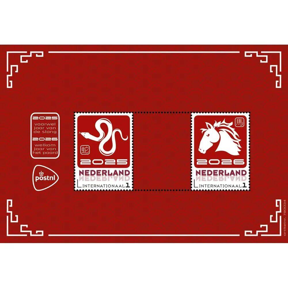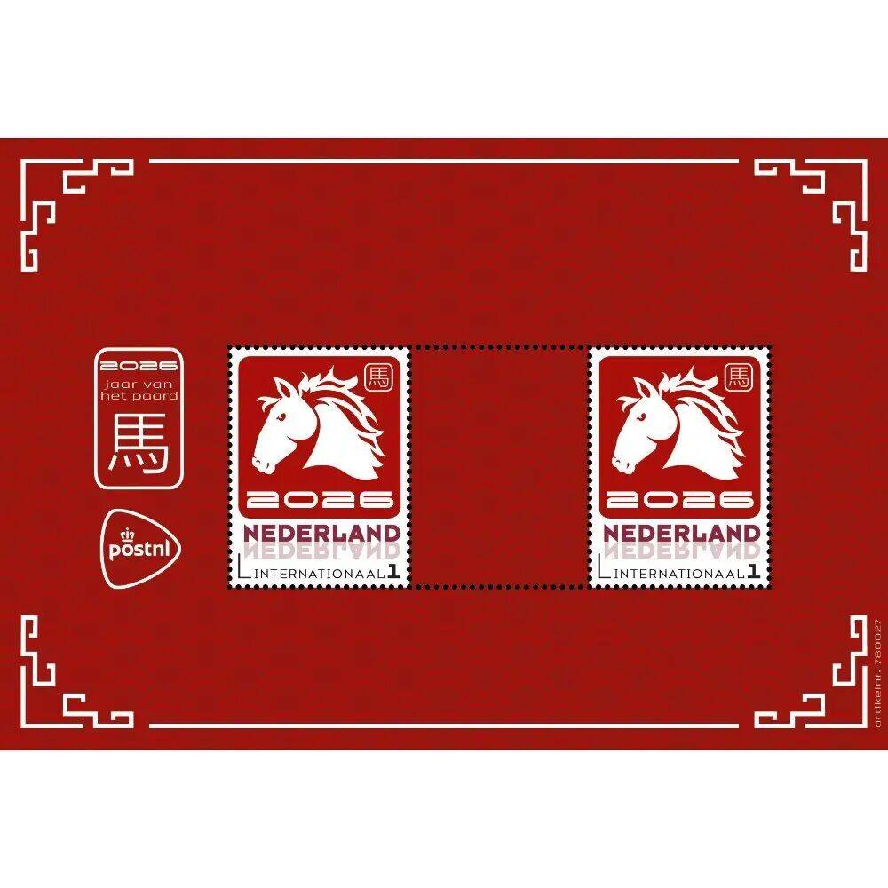 荷兰邮政发行的马年生肖邮票采用个性化特别版式,面值按国际一类邮资设定。设计延续该系列的红白配色风格,主图为白色马首剪影,右上角钤有汉字“马”的印章。该邮票以两枚版小全张形式发行。同时,邮政部门还于2025年11月11日发行过蛇年与马年主题交替张。