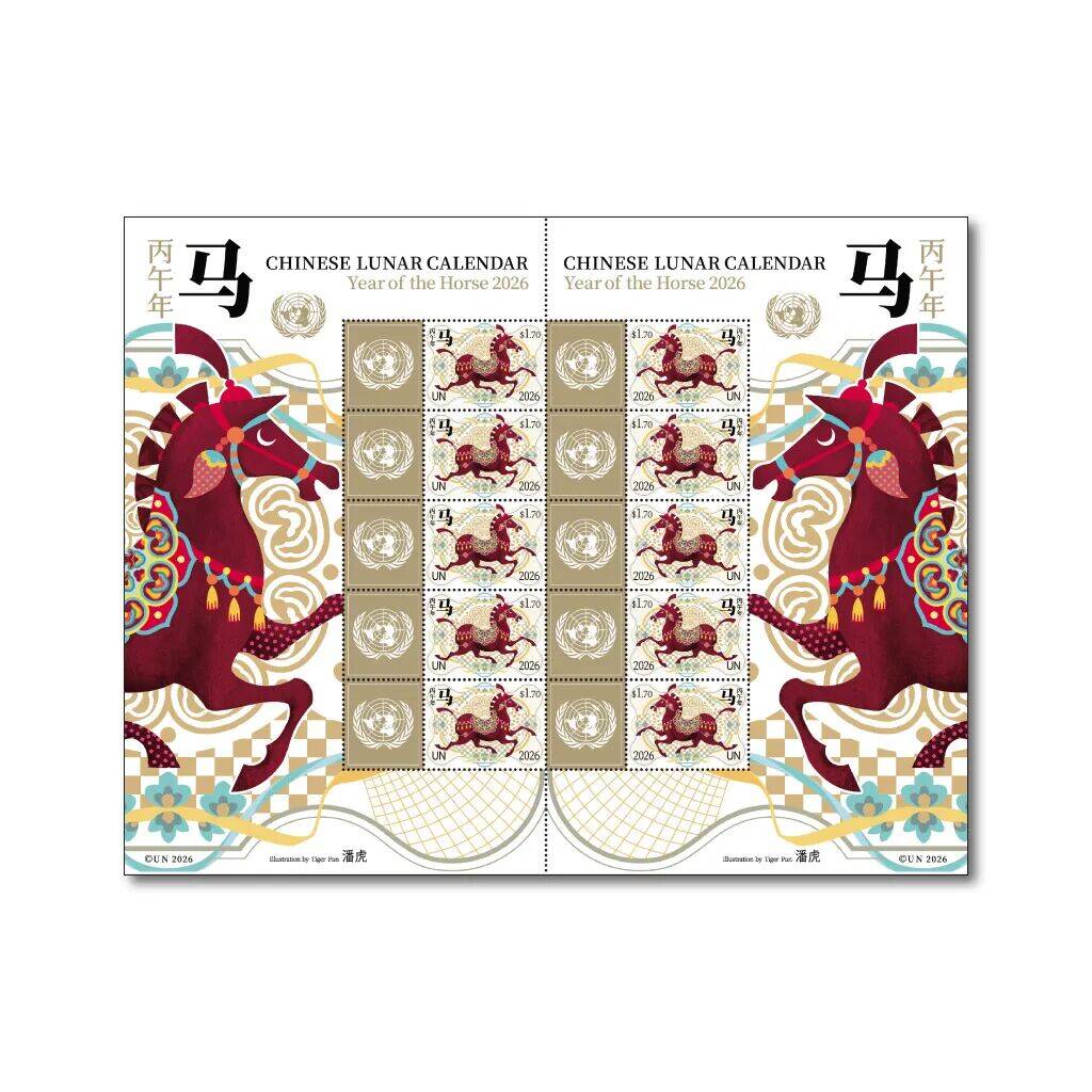 1月16日,联合国邮政以个性化特别版式发行丙午年生肖邮票,这也是中国设计师潘虎为联合国邮政设计的第6套生肖邮票。邮票主图的骏马设计灵感取自东汉青铜器“铜奔马”,而配色和背景则从敦煌汲取了灵感。小版张含10枚马年生肖邮票和联合国会徽图案附票,售价20.50美元。小版张延续这轮设计风格,中心齿孔线上下贯通,撕开后左右对称。