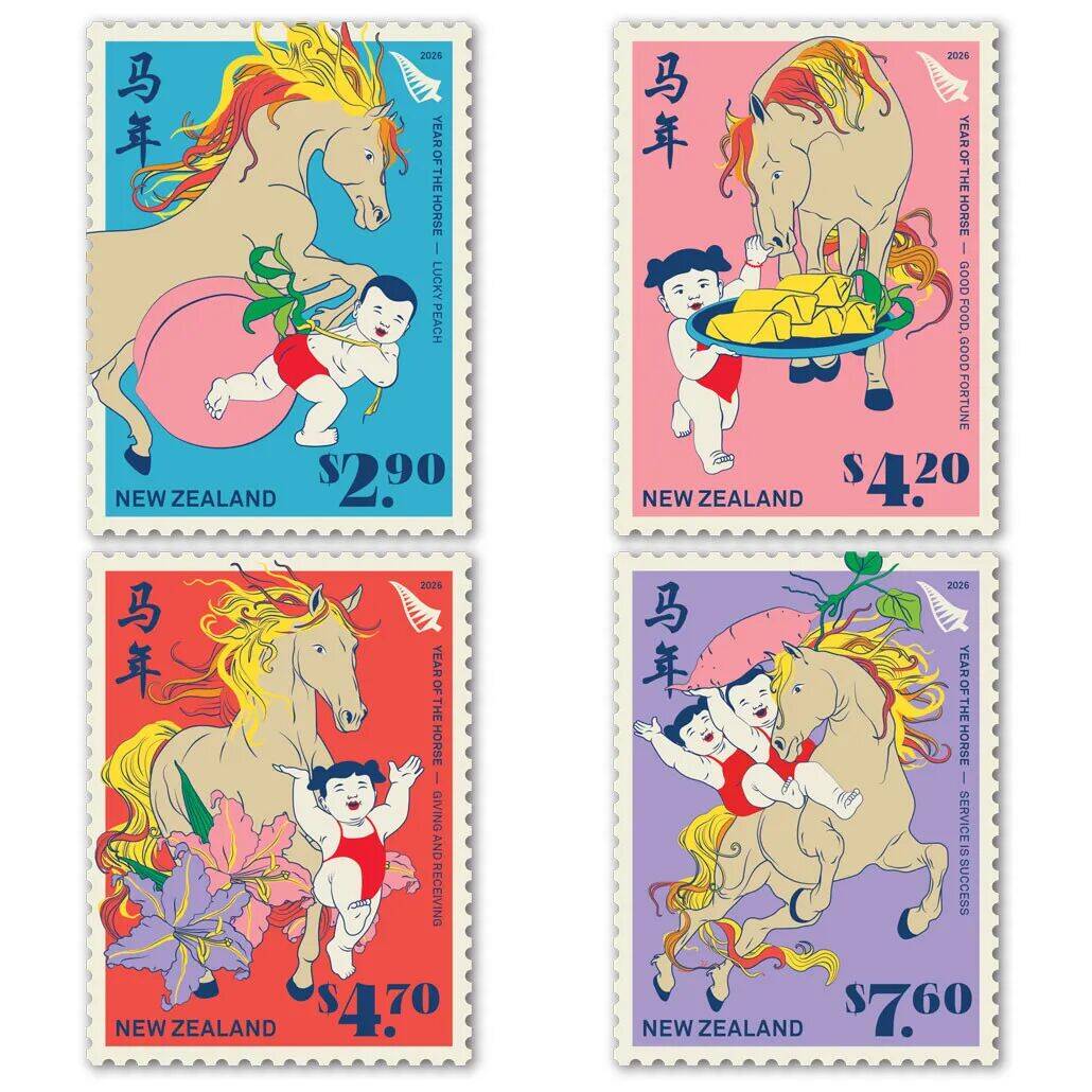 同处大洋洲的新西兰邮政则在14日发行其生肖马年邮票,设计延续该系列风格,将生肖动物与年画娃娃结合,每一枚都通过食物和植物,讲述了新西兰华裔移民的故事——从经营果蔬生意超50年的Jack Lum,到用编织艺术展现传统食物的艺术家Bev Moon,再到用陶瓷百合纪念19世纪淘金潮华工的Cindy Huang,以及通过园艺创新造福社会的Joe和Fay Gock夫妇,这套邮票成为一幅新西兰华裔社区贡献的缩影图。