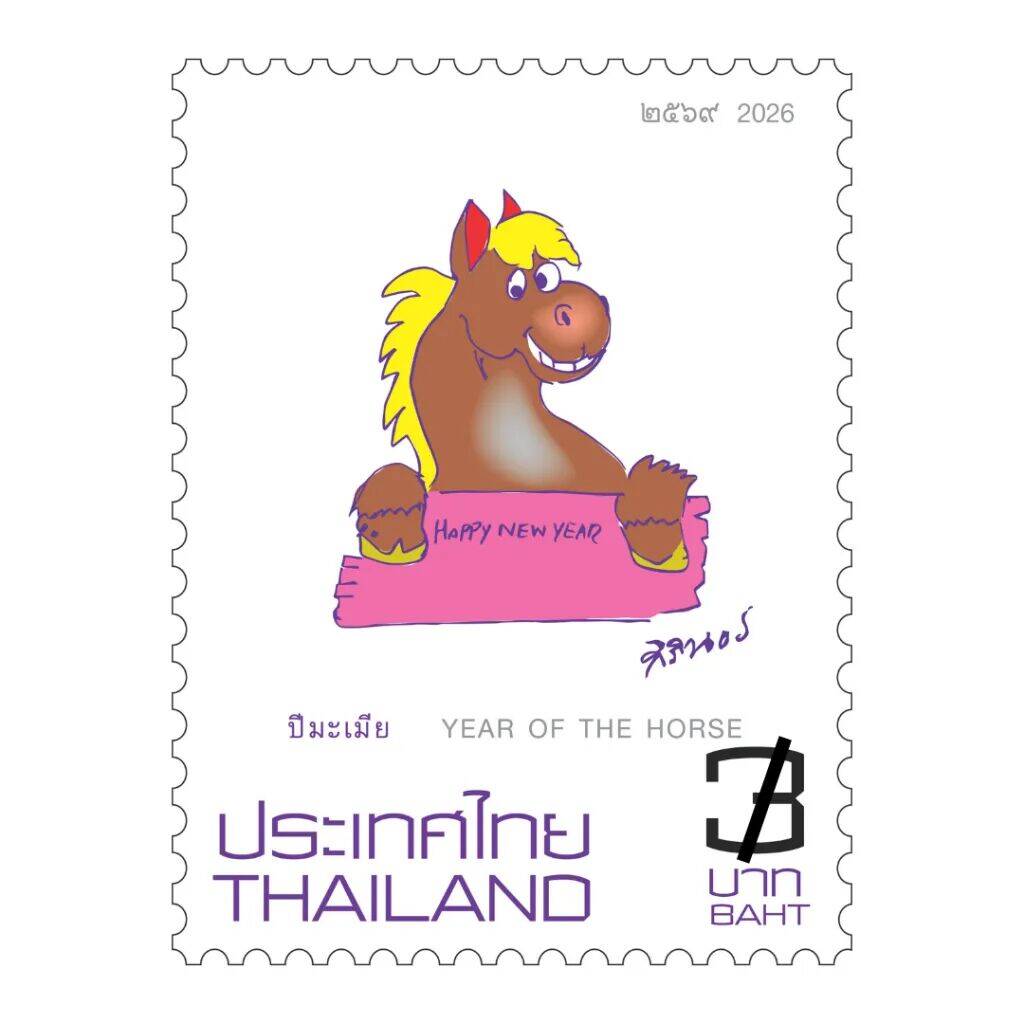 2026年1月5日,泰国邮政发行的马年生肖邮票为该国第三轮生肖邮票系列画上圆满句号。与蛇年相同,邮票原稿由诗琳通公主亲自绘制。公主以亲切的卡通笔触,描绘了一匹前蹄轻搭栅栏的微笑骏马,栅栏上饰有英文“新年快乐”字样,传递出温馨喜悦的新春祝福。