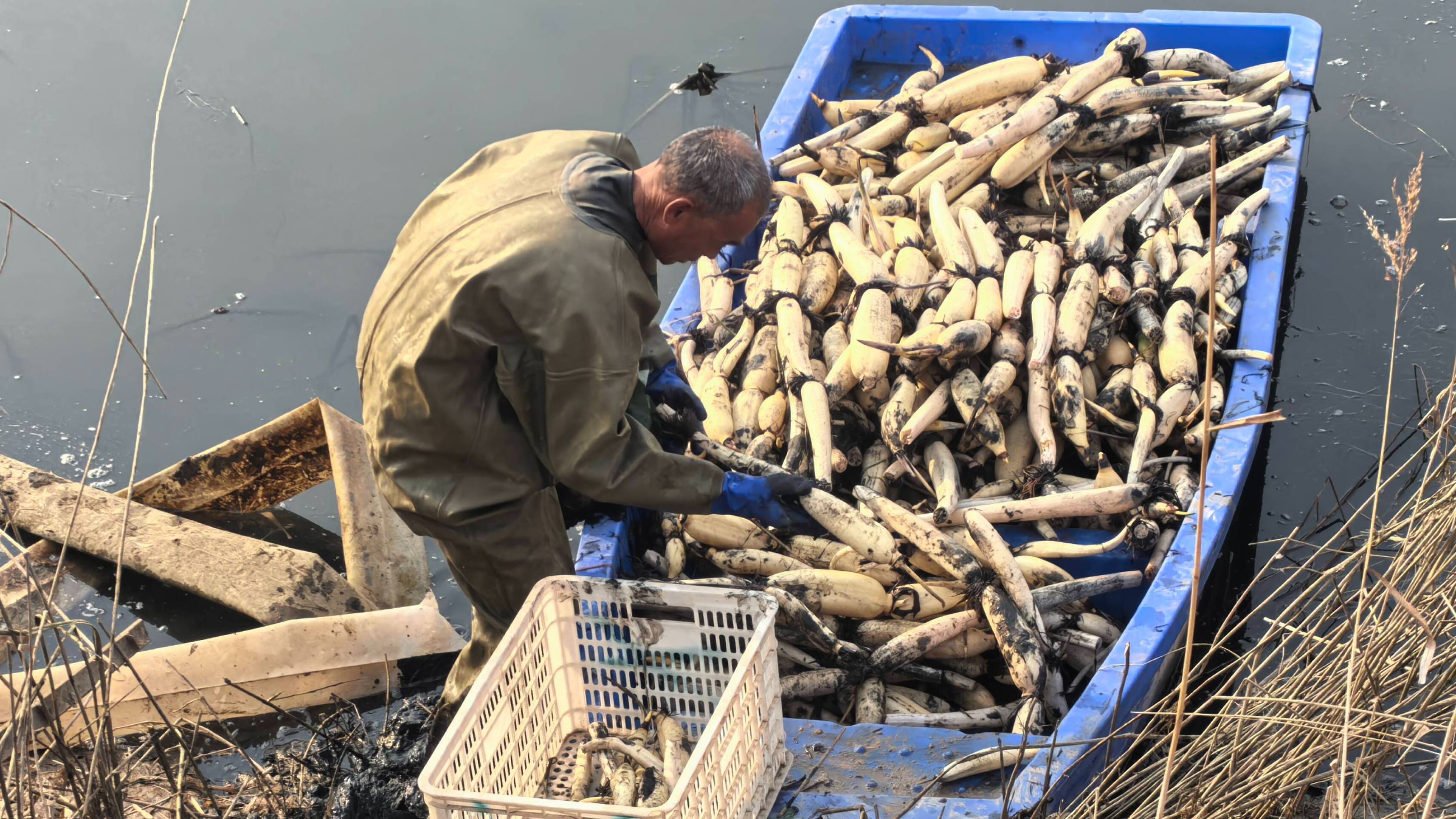 镜头前,藕农们身着防水裤,在冬日的水塘中熟练地探摸、拔起,一根根白莲藕被陆续托出水面。于俊新一边讲解莲藕的品种特点与食用价值,一边展示采藕过程,并与线上观众实时互动,解答关于口感、烹饪等方面的问题。这种直观、真实的场景迅速吸引了众多关注。