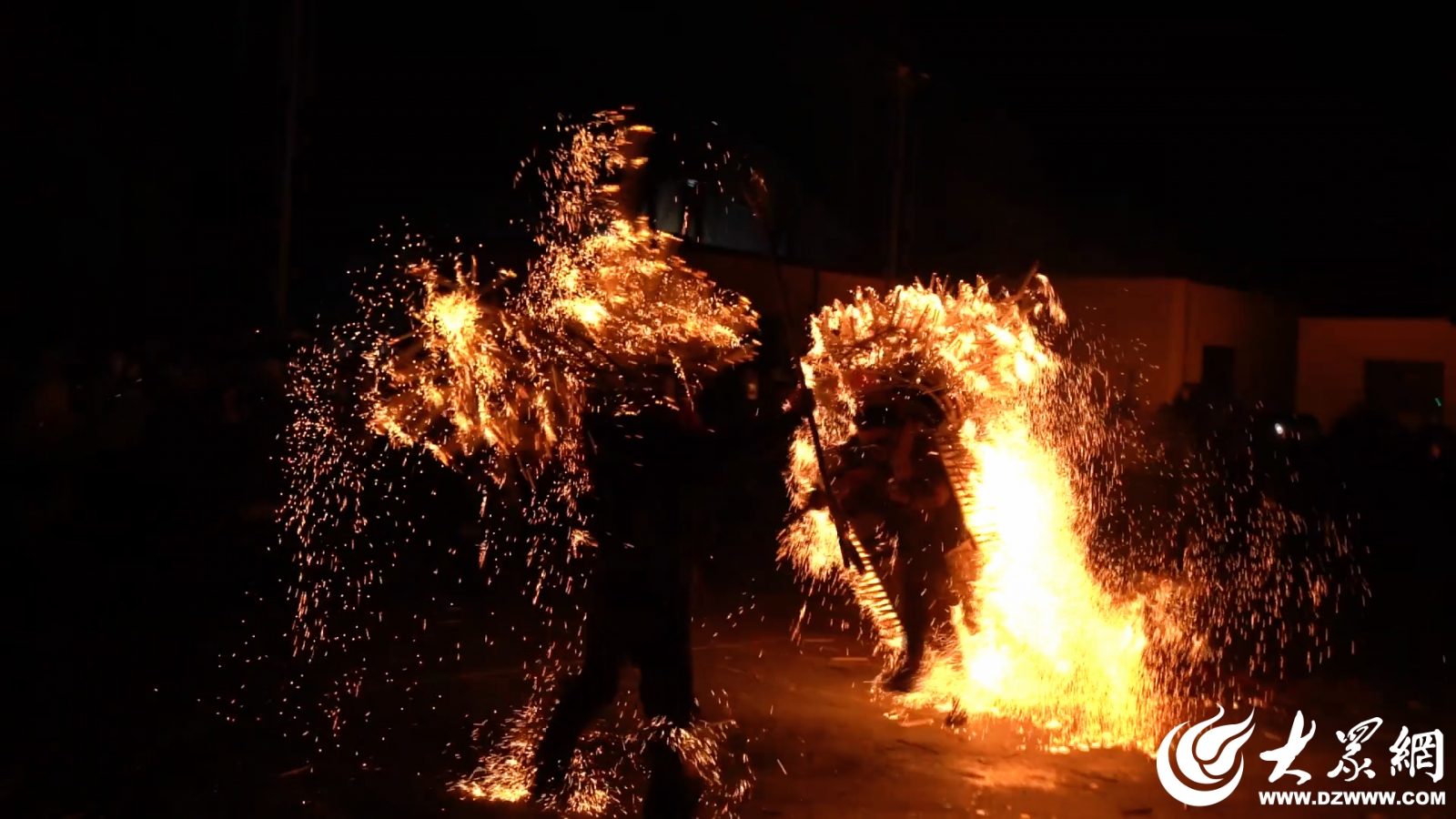 “火虎”表演由顶虎人与打虎人构成,距今已有百余年历史,由邹城市平阳寺村周氏族人,融合传统舞狮技艺与民间礼花筋表演创新演变而来。礼花筋俗称火捻子,其燃料由村民采用木炭特制而成,制作工序十分繁复。想要呈现一场精彩的火虎表演,并非易事。不同于普通的民俗表演,火虎演出有着严格的人员和筹备要求,一场表演至少需要十五六位表演者通力合作,从火捻准备到虎头制作,整体筹备周期长达半个月左右。表演前,村民以毛毡纸包裹炭灰制成火捻,再将其逐一插装在带孔的虎形背板与藤条编织的虎头之上;打虎人的帽子、腿部与背部,同样需要用火捻子精心装点。一块虎背板上便有一千多个孔洞,每个孔中要插入三根火捻,一场完整的火虎表演,至少需要准备三千六百多根火捻子,单是穿戴装备就需众人协助。