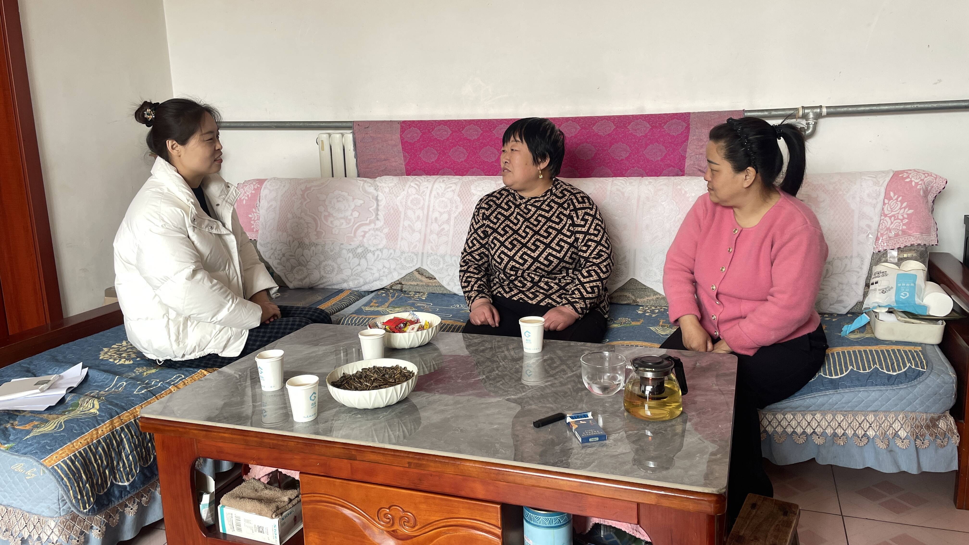 李秀丹(右一)和邻居杨金芳(中间)向记者讲述家庭故事