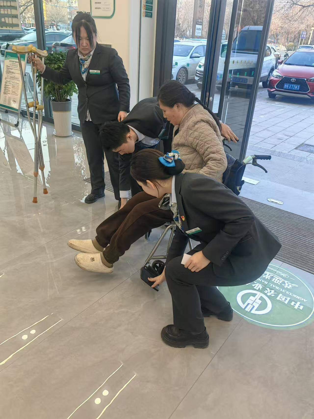2025年12月24日,农行德州开发区支行营业部内,一位腿脚不便的老人在女儿的陪伴下缓缓推门而入。老人拄着拐杖步履蹒跚,每一步都显得格外吃力。正在大堂的工作人员小赵第一时间注意到了这一情况。