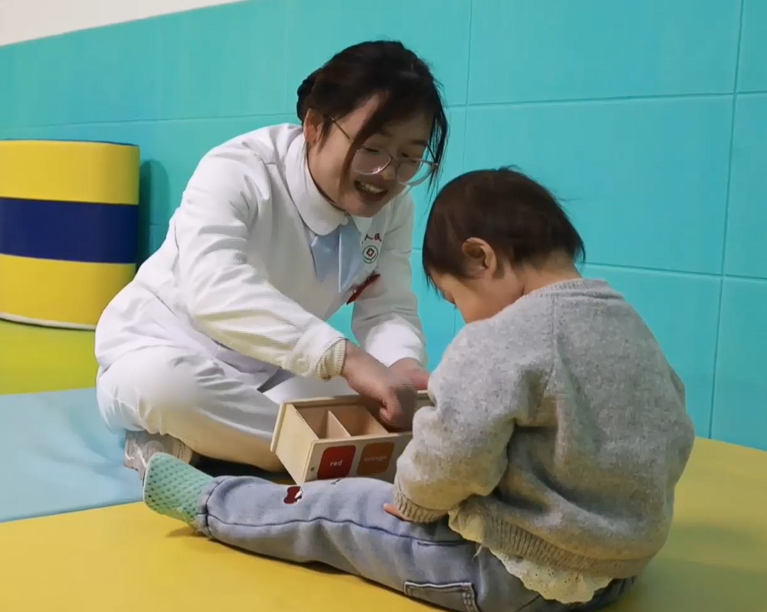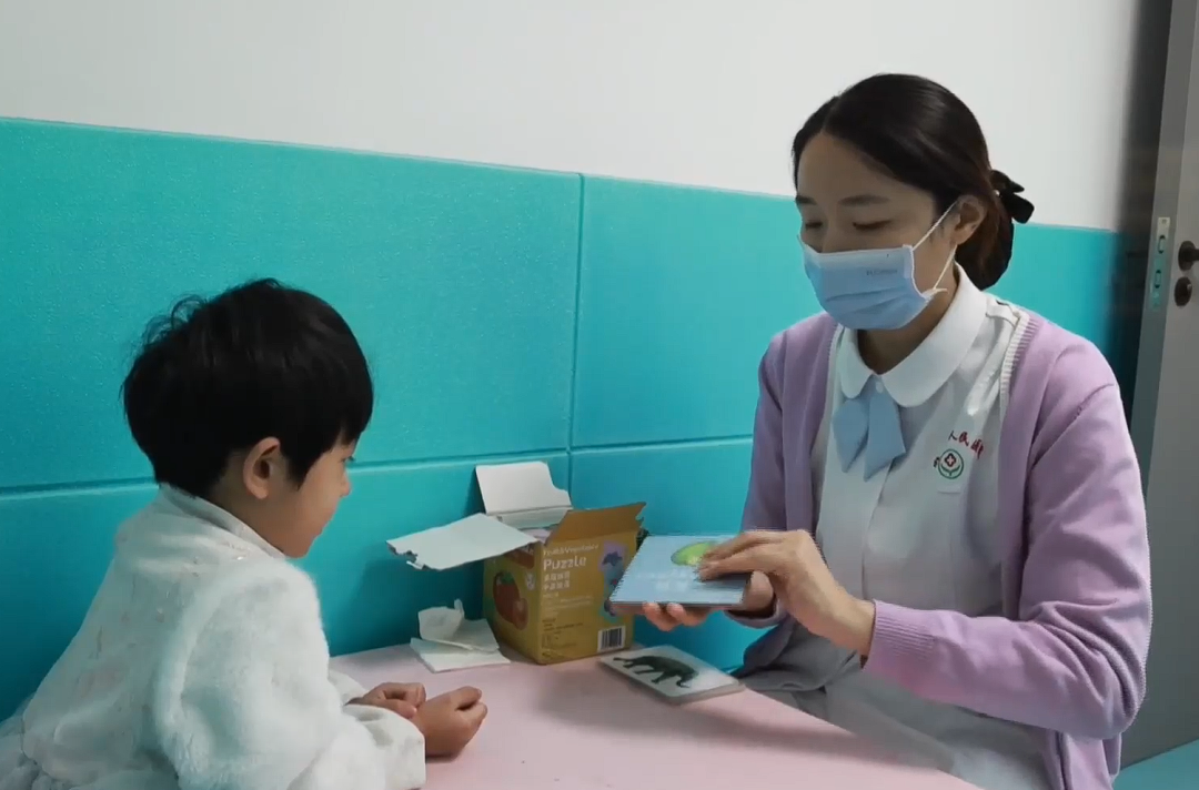 在临邑县人民医院早期干预儿童发展中心内,3岁的小朋友端坐在小椅子上,认真辨认拼接着康复师手中的卡片。