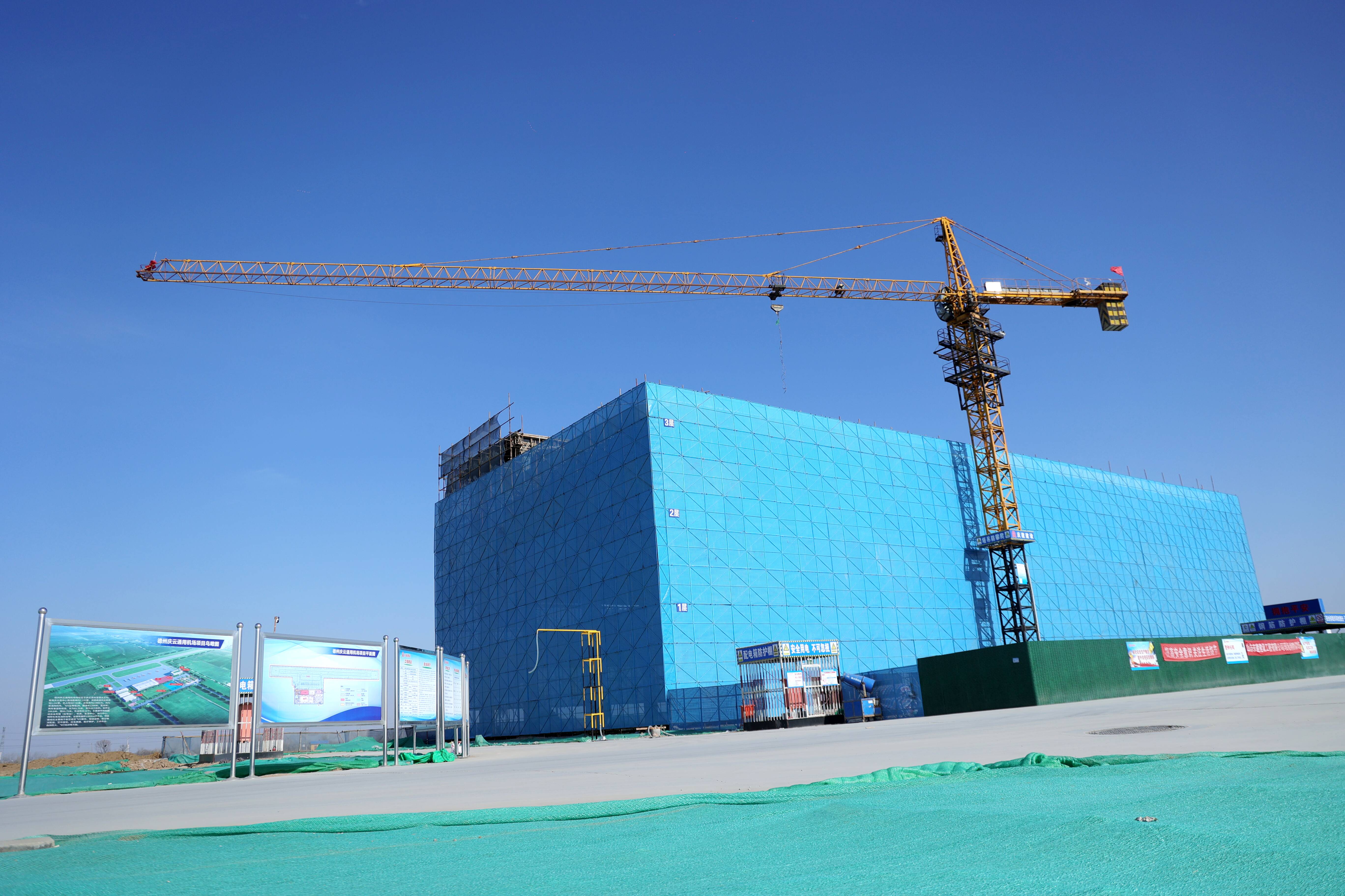 庆云通用机场总占地407.92亩,为A1类通用机场,飞行区等级2B。项目拟建设1200米×30米跑道一条,两条垂直联络道,尺寸为长61.75米×宽10.5米;机坪尺寸为299.8米×83.75米;建设综合业务楼(含塔台)、机库、生活中心、动力中心、特种车库及消防站、污水处理站、门卫室等建筑。目前,航站区工程综合业务楼三层、生活中心顺利封顶,机库承台基础浇筑混凝土、特种车库及消防站基础浇筑混凝土完成顺利通过验收。