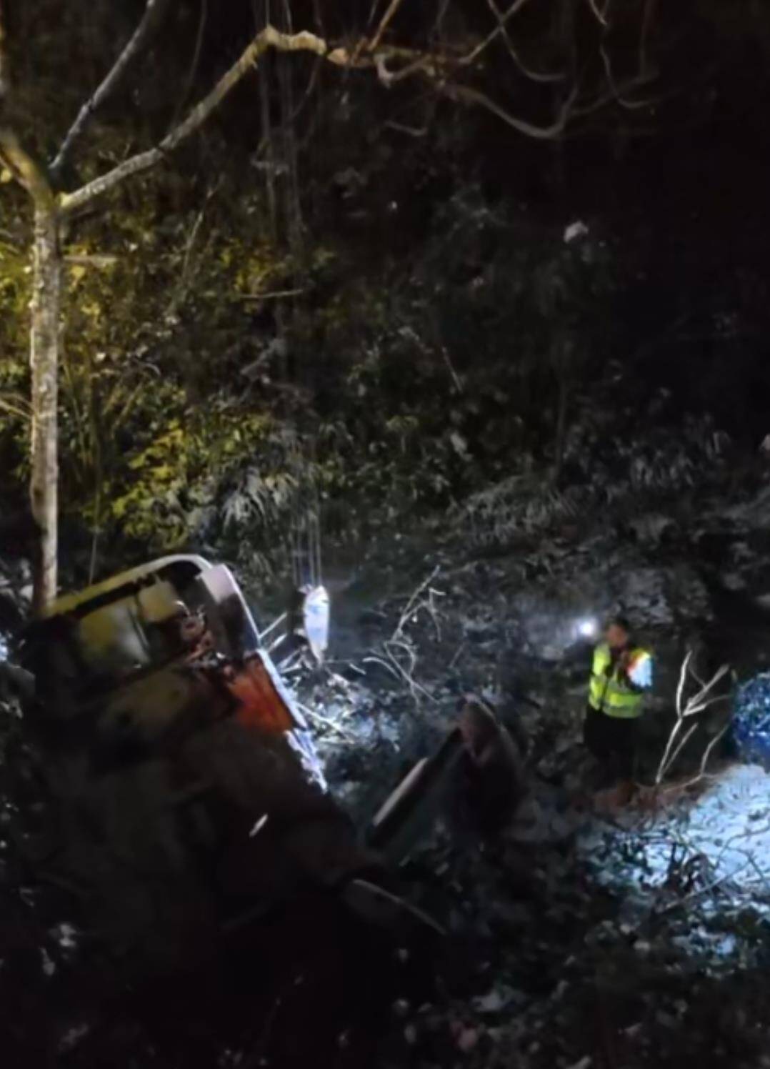 抵达现场后,漆黑的沟底与复杂地形让吊车难以精准作业。“我下去查勘!”王勇话音未落,便沿着湿滑的沟壁往下挪动。积雪下的杂草与碎石暗藏险情,在接近事故车辆时,他脚下一滑重重摔坐在地。“小心!小心啊!”山沟上方的苏先生惊呼出声,王勇爬起来拍拍身上的积雪,抬头笑道:“没事没事,路是滑了点。”