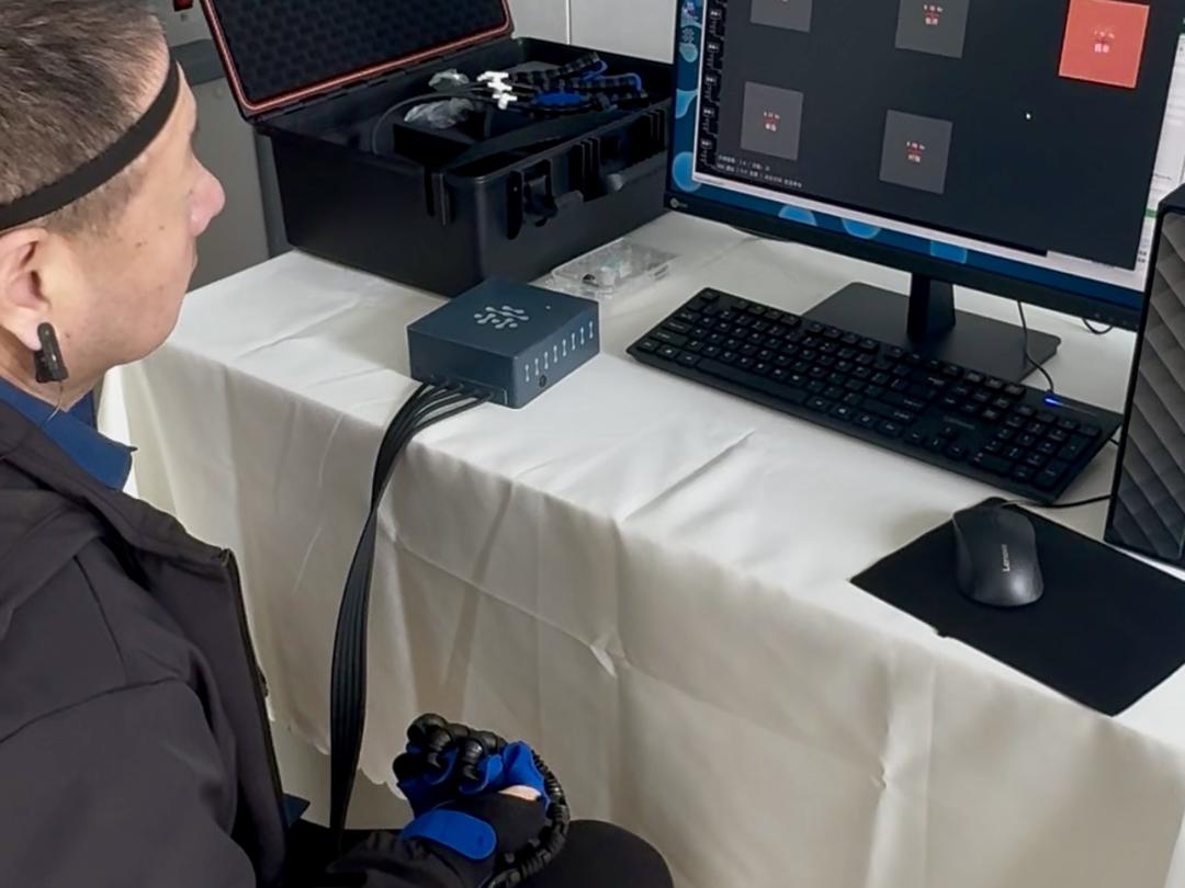 在治疗区,一位脑卒中后偏瘫失语的患者正在工程师指导下体验非侵入式脑机接口设备。他头戴脑电帽,右手绑着气动手套,注视着屏幕上闪烁的图案。随着意念驱动,他的右手慢慢收拢,手指“听话”地抬了起来。