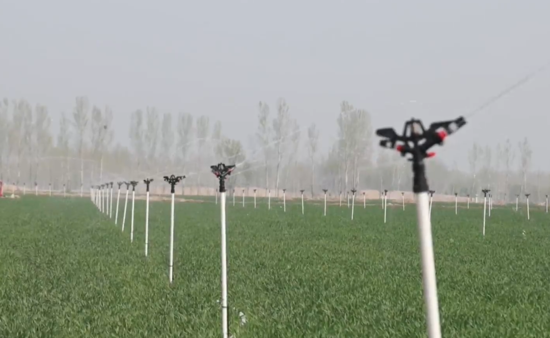与此同时,在兴隆镇中兴家庭,绿油油的麦田里,几十根长达120米的喷灌带均匀铺展。上百个喷头匀速转动,水花均匀地洒落在麦苗上。与传统灌溉方式相比,这种自动化喷灌设备自动化程度高、控制面积大,且适应性强,仅需一人就能轻松完成麦田浇灌任务。